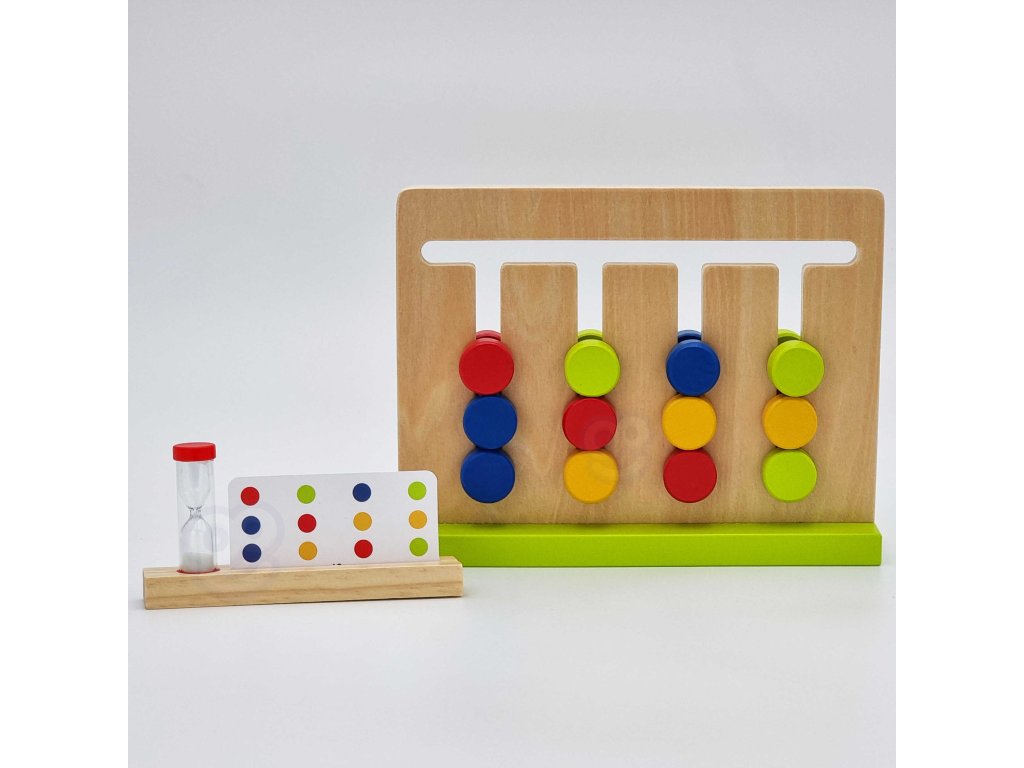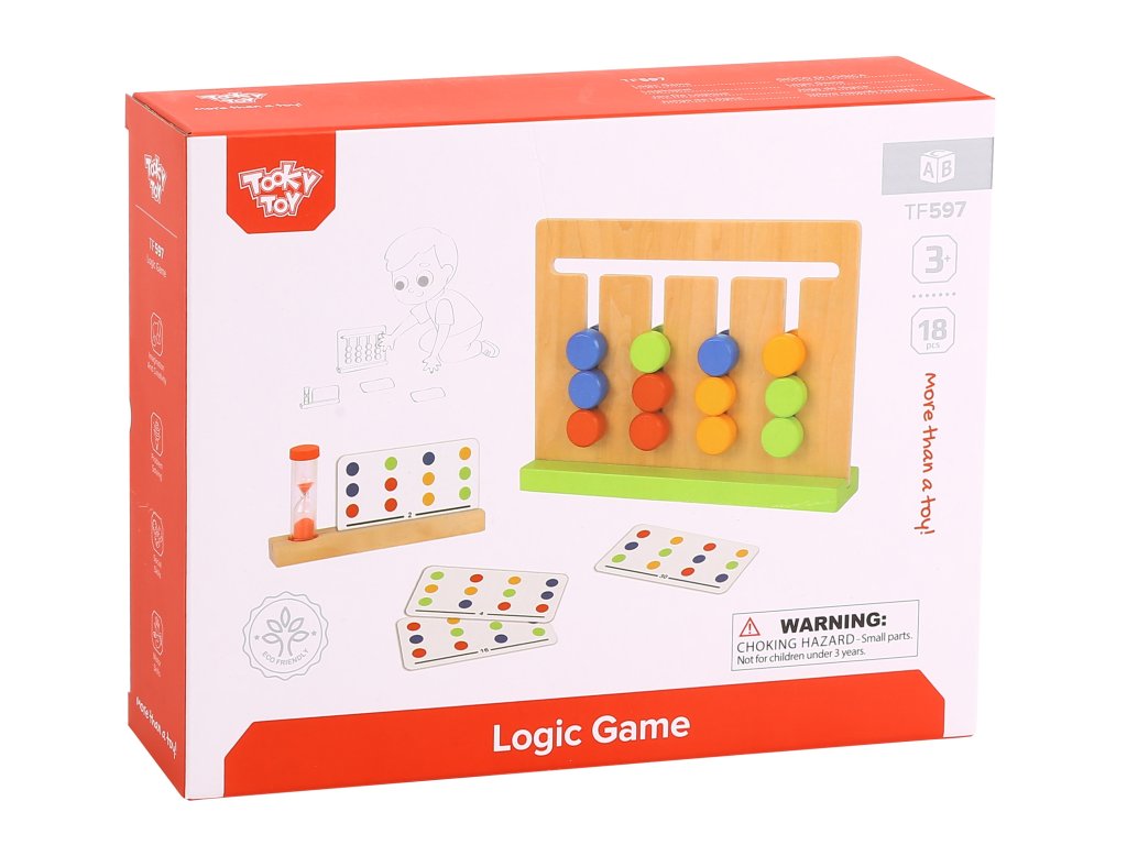 Logická hra odTooky Toy poskytne vášmu dieťaťu hodiny interaktívnej hry, počas ktorejnaučiť sa základnéfarby inasledujúce návrhy. Táto hračka sa dodáva s dreveným rámom, presýpacími hodinami a15 obojstranné karty s30 vzory. Úlohou dieťaťa je v danom čase zopakovať vzor z karty.