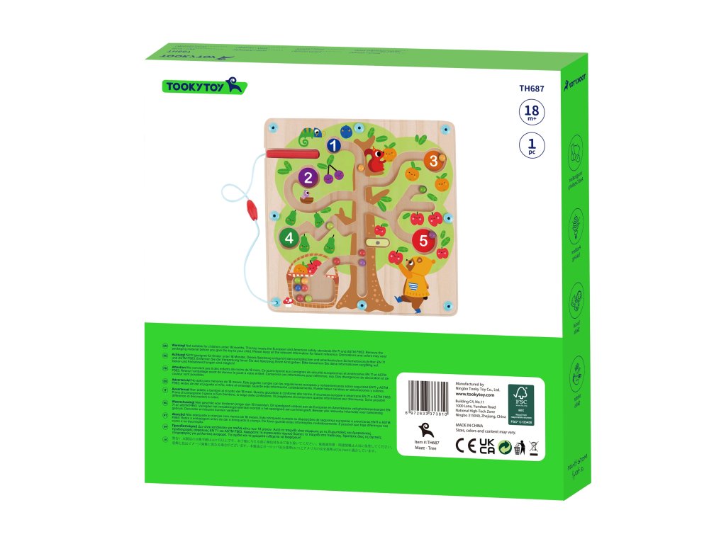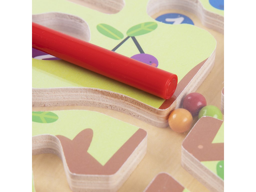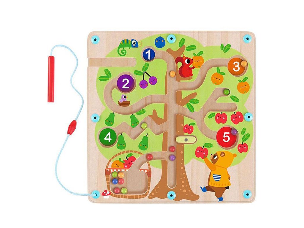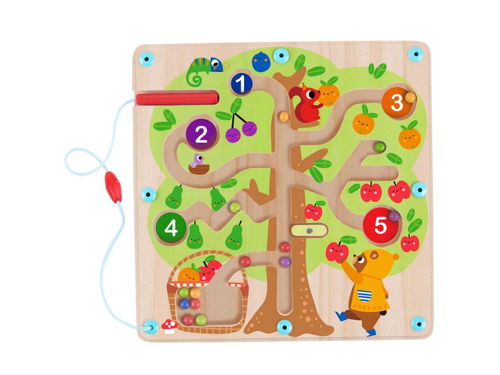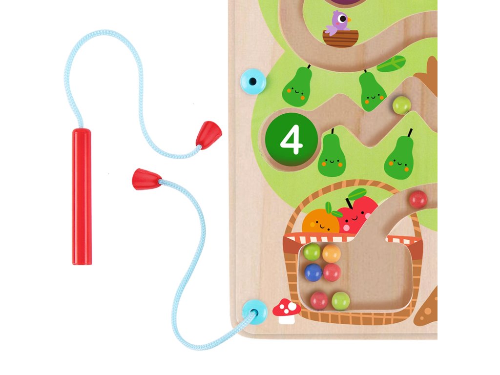 Hračka Labyrint ovocný strom poskytuje deťom náučnú zábavu pri hľadaní správnej cesty. Úlohou pre najmenších je nájsť správnu trasu v bludisku pre farebné magnetické korálky na príslušných miestach. Formou hry rozvíjajú sa zručnosti pri riešení problémov, motorické zručnosti a základy počítania. Skvelé bludisko pre mladé mysle, ktoré môžu skúmať a rozvíjať.