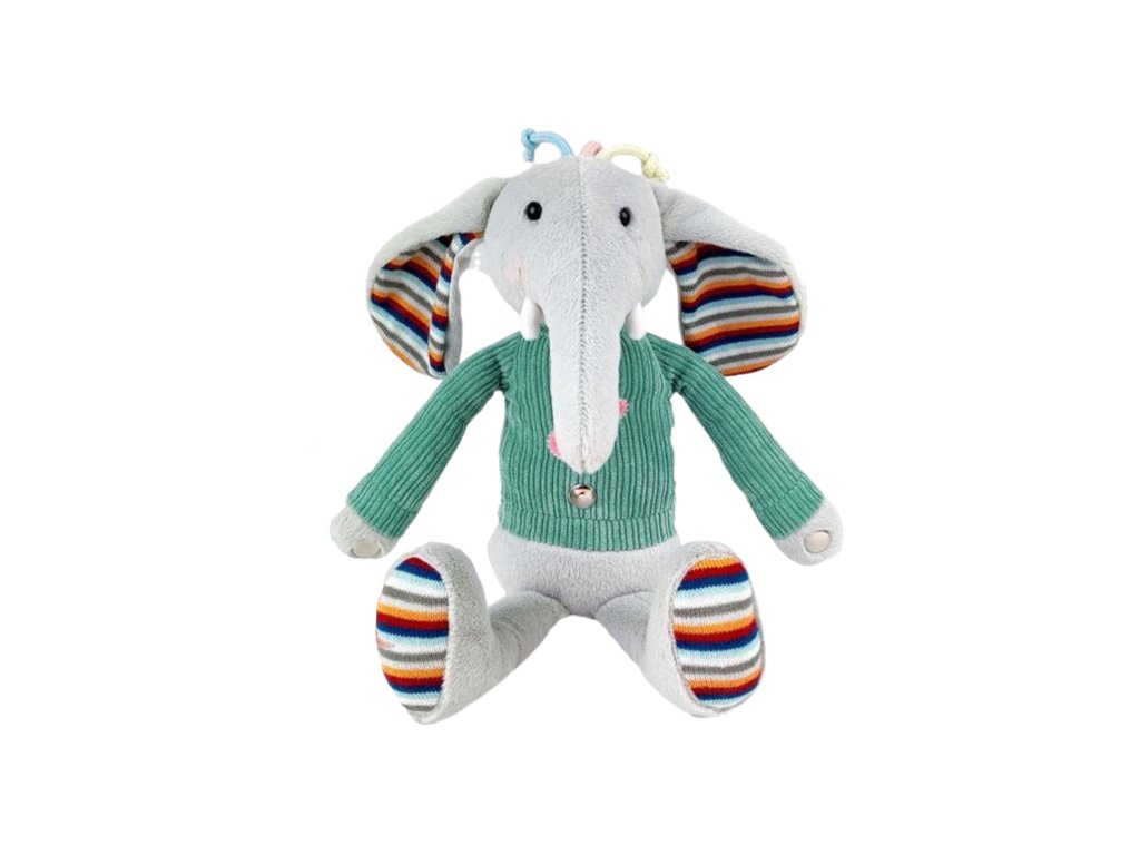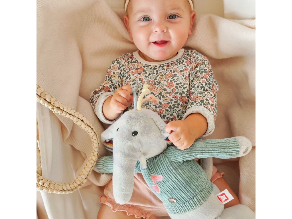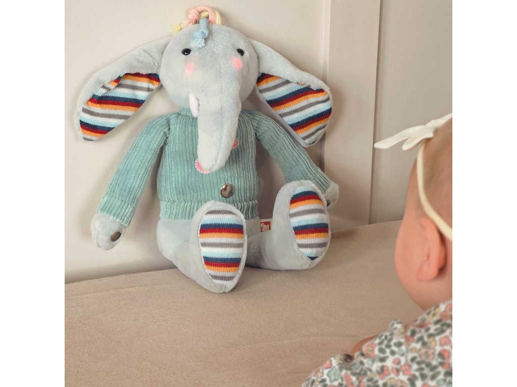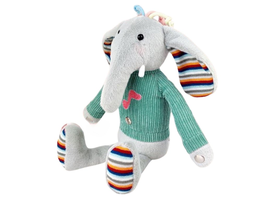 Plyšová hračka je vybavenátri zmyslové zóny - na labkách a brušku, ktorého dotyk sa mení na hudbu. A jeho ružové líčka sú osvetlené, čo vytvára okolo hračky skutočnú rozprávkovú atmosféru. Plyšová hračka je oblečená do svetríka, pod ktorým je ukrytý priestor na 3 batériemäkký dotyk slona sa stanepriateľ dieťa po mnoho rokov.