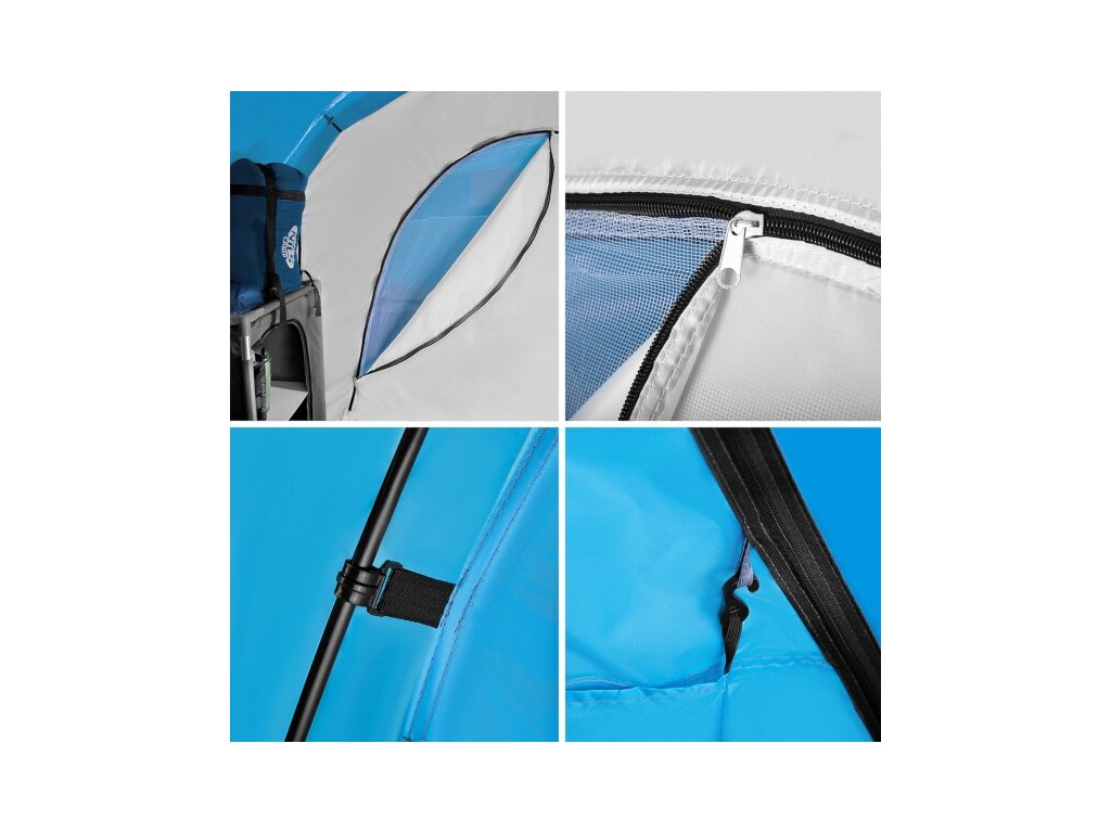 Stan je vyrobený z polyesteru s polyuretánovou povrchovou úpravou a podlepenými švami, vďaka čomu je vodotesný až do vodného stĺpca 3 000 mm H2O - takže zvládne aj jesennú búrku. Tkanina je odolná voči UV žiareniu, nevybledne a nestráca pevnosť.
