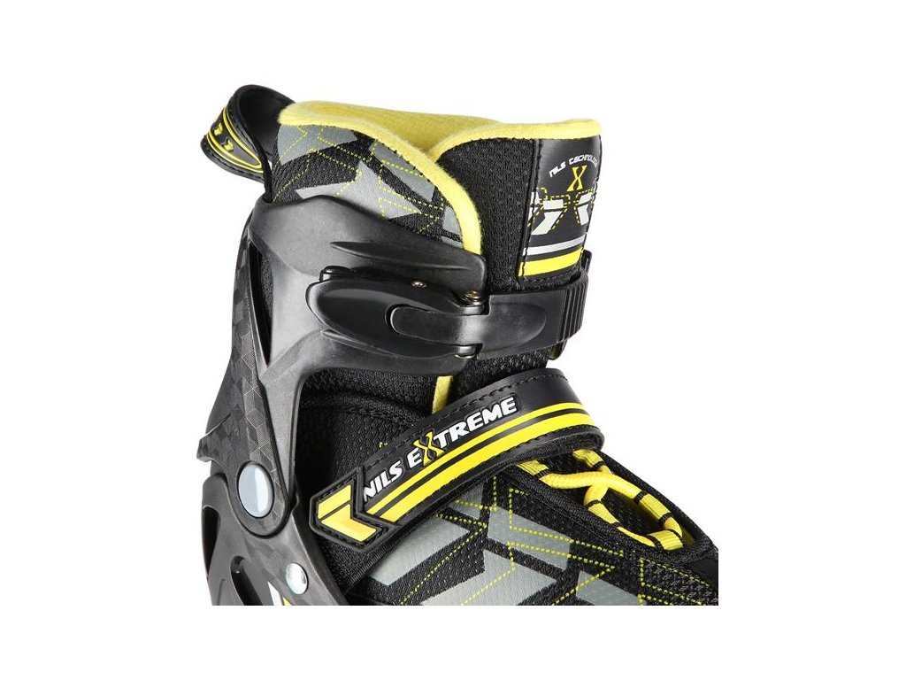 Kolieskové korčule NILS Extreme NA11002 sú určené k rekreačnej jazde začínajúcich a mierne pokročilých korčuliarov po rovných a hladkých chodníkoch, ako napríklad po asfalte. Ľahká a odolná topánka zaisťuje bezpečnosť pri jazde. Systém ventilácie a tvarovaná stielka topánky priamo ovplyvňujú zvýšenie užívateľského komfortu. Jedná sa o model s nastaviteľnou veľkosťou, kedy každá korčule má na výber zo 4 rozmerov. Pomocou jednoduchého riadiaceho systému je možné ľahko a rýchlo nastaviť veľkosť topánky na nohe používateľa. Kolieska s tvrdosťou 82A sú uložené v hliníkovej lište, dobre priliehajú k podkladu a čiastočne pohlcujú nervnosti. Model NA11002 je osadený ložiskami ABEC 7, ktoré sa vyznačujú precíznym spracovaním a nízkym odporom, kedy jazda má dobrú zotrvačnosť a na korčuliach tak možno prejsť dlhú vzdialenosť bez vynaloženia zbytočnej sily.