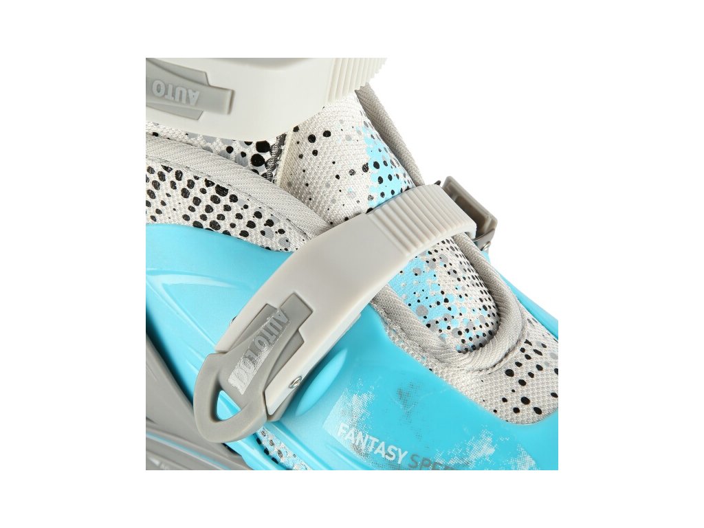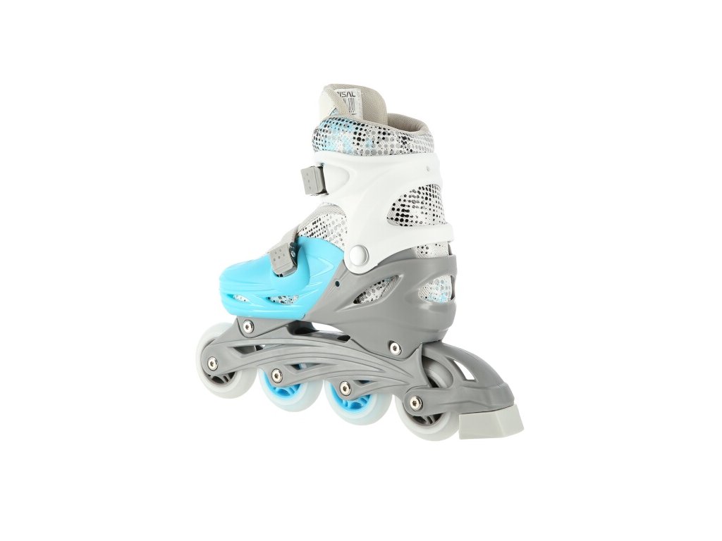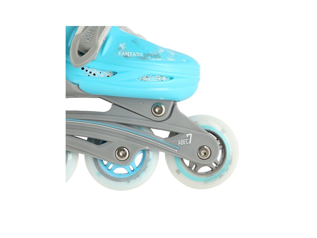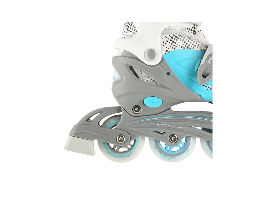 Plastový podvozok je vybavený mäkkými PU kolieskami s ložiskami ABEC7, ktoré zabezpečujú svižnú jazdu. Vonkajšia topánka je nastaviteľná do štyroch veľkostí stlačením tlačidla, toto riešenie umožňuje presné nastavenie veľkosti podľa aktuálnych potrieb alebo použitie ako "rastúca topánka", ktorá "rastie" spolu s detskou nohou.