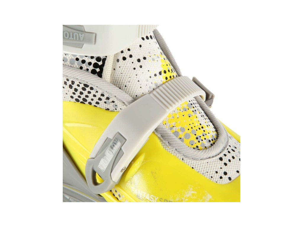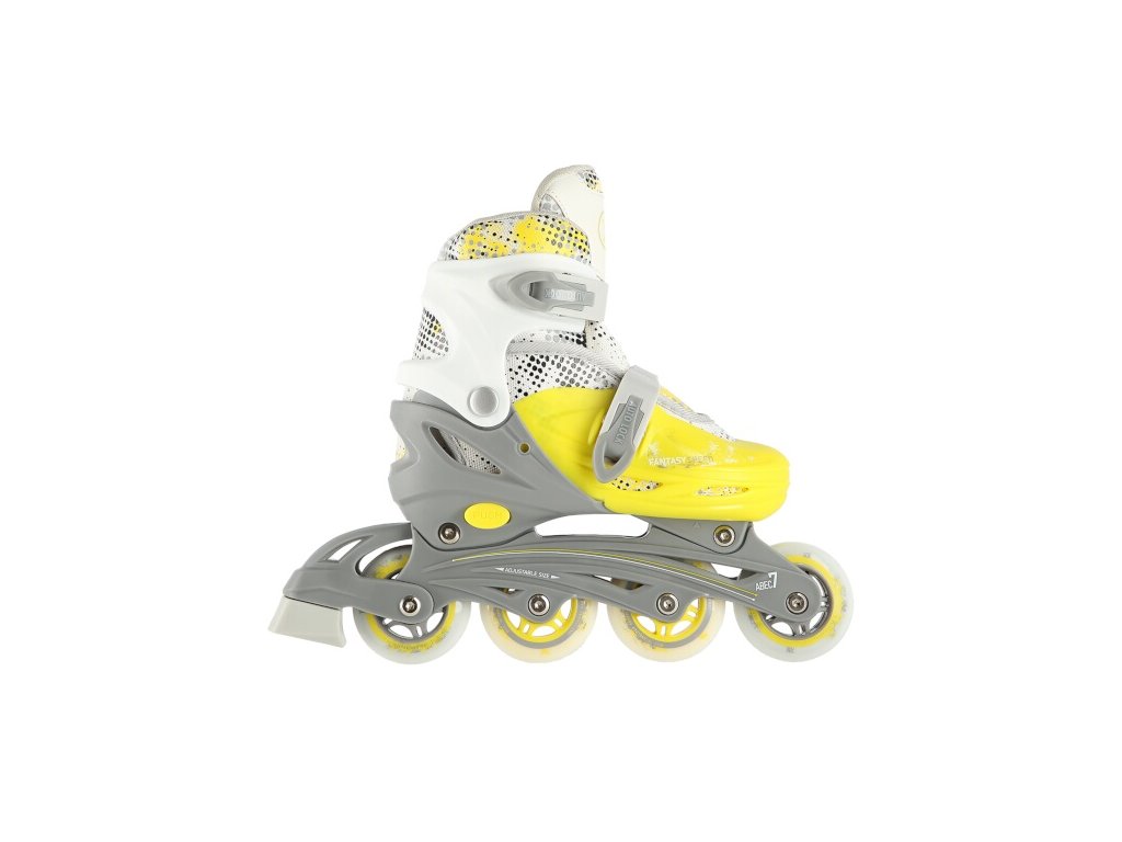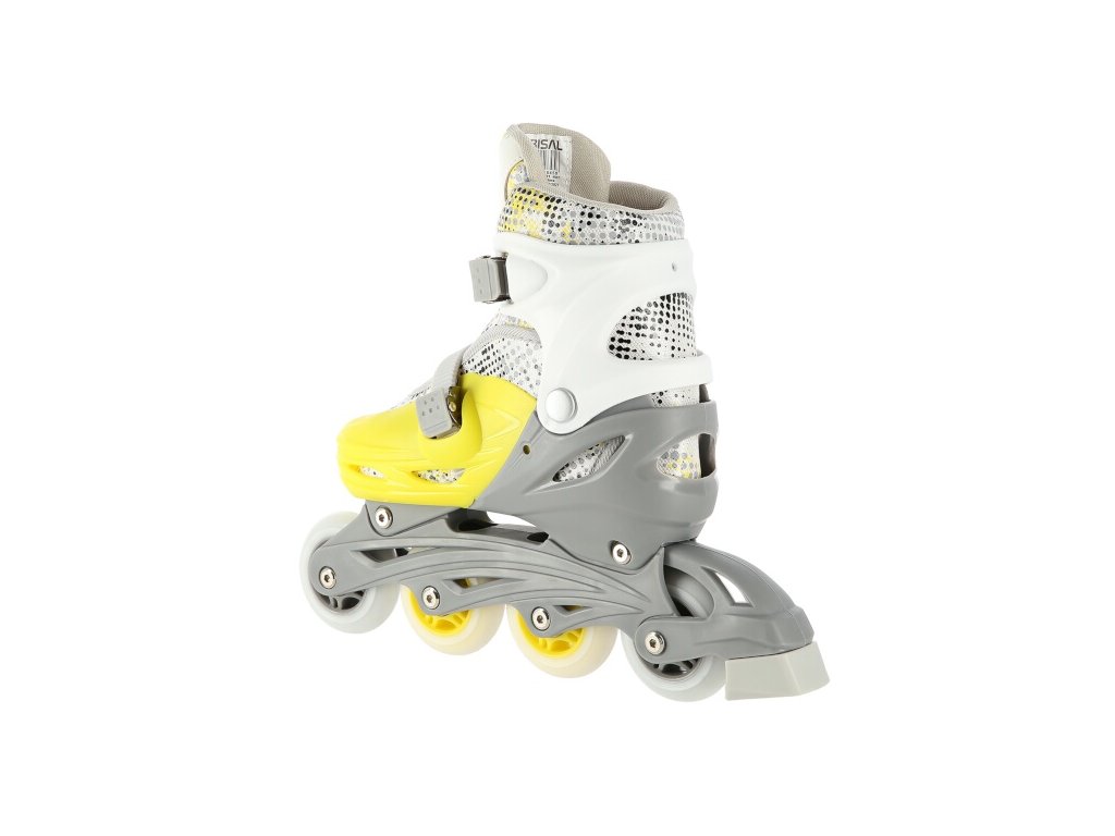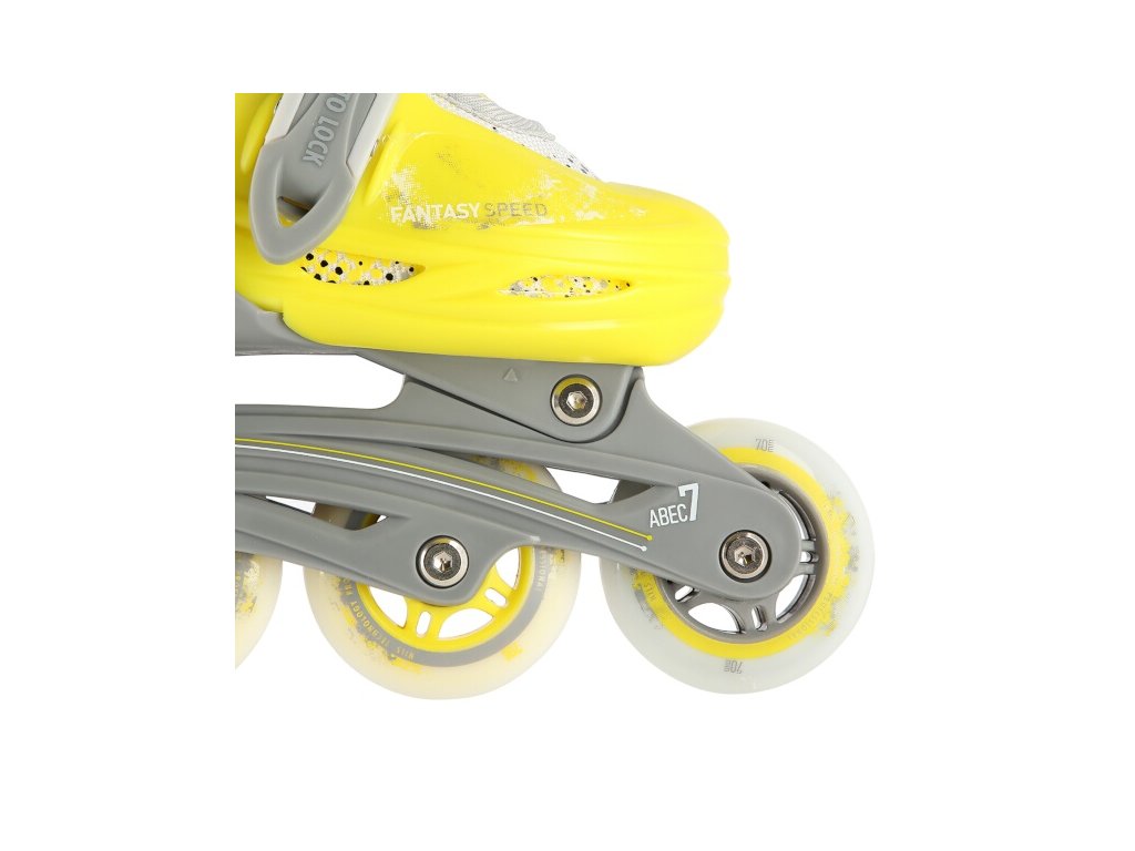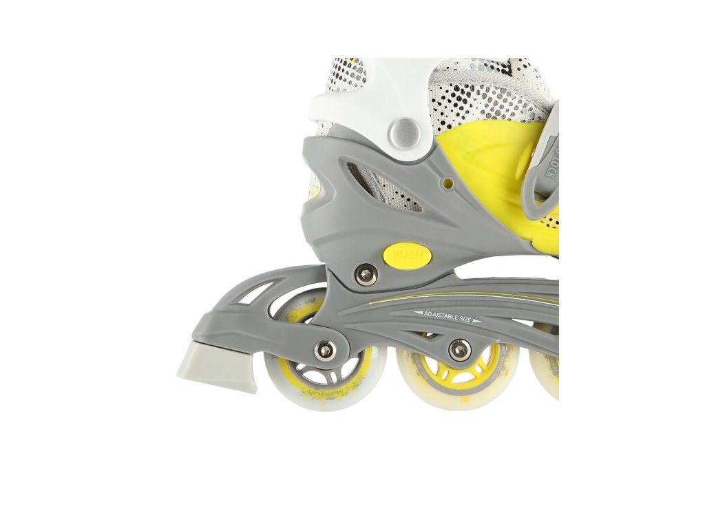 Plastový podvozok je vybavený mäkkými PU kolieskami s ložiskami ABEC7, ktoré zabezpečujú svižnú jazdu. Vonkajšia topánka je nastaviteľná do štyroch veľkostí stlačením tlačidla, toto riešenie umožňuje presné nastavenie veľkosti podľa aktuálnych potrieb alebo použitie ako "rastúca topánka", ktorá "rastie" spolu s detskou nohou.