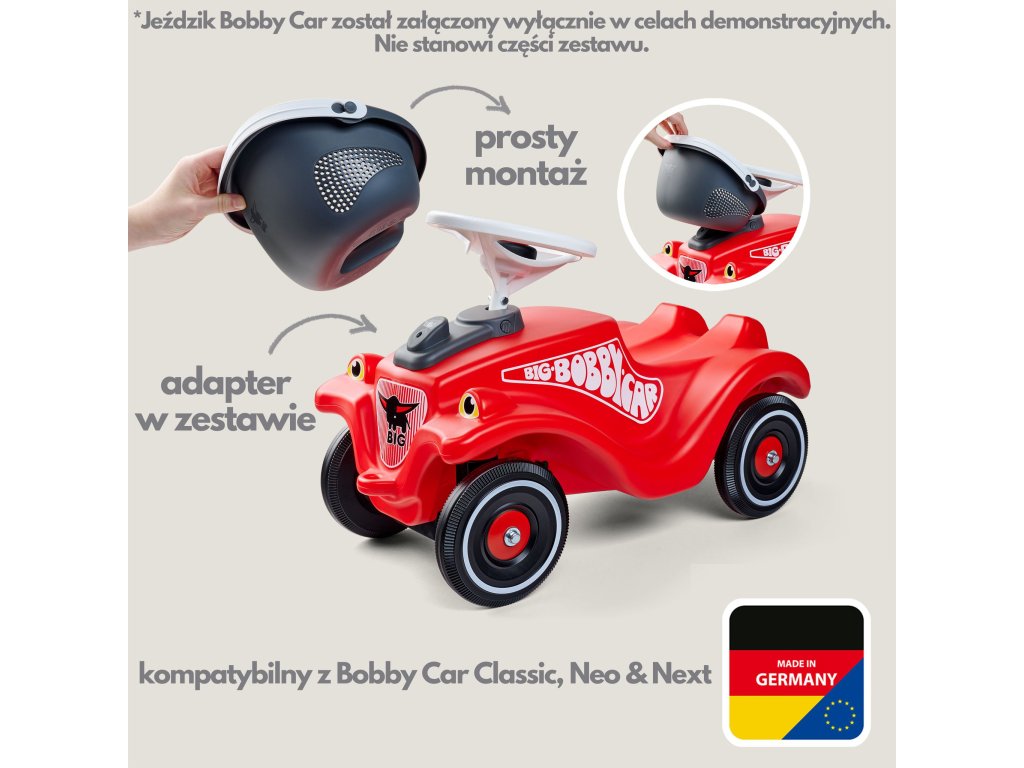 - - kompatibilita: Adaptér je vhodný pre všetky originálne modely Bobby Car, ako napríklad Bobby Car Classic, Bobby Car Neo a Bobby Car Next.