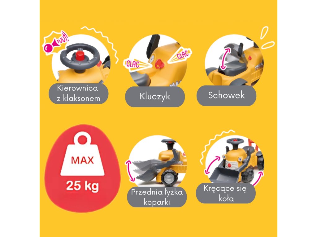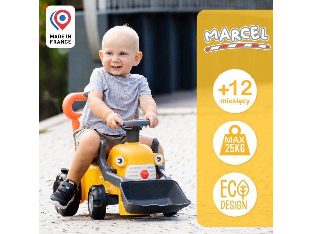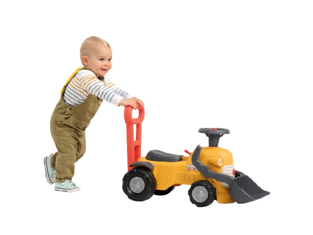 Značka rýpadla/jazdca MarcelFALK je prvé kompaktné vozidlo s funkčnou prednou lyžicou, volantom s klaksónom a praktickou rukoväťou na tlačenie, ktoré umožňuje hru v interiéri aj exteriéri od 12 mesiacov. Vďaka robustnej konštrukcii a premysleným detailom - ako je cvakajúci kľúč, otáčajúci sa volant a úložný priestor pod sedadlom - je každá jazda kombináciou pohybu a hrania rolí.
