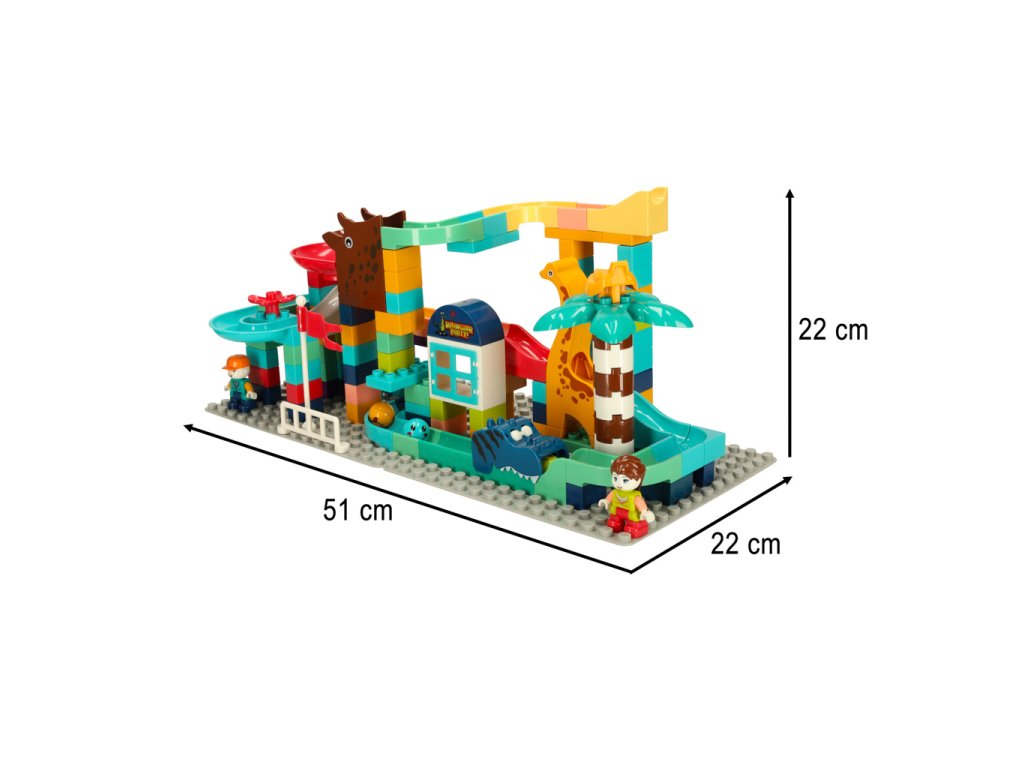 Súprava sa skladá zo 140 kociek, z ktorých si vaše dieťa môže postaviť vlastnú guľôčkovú dráhu! Dieliky môžu ľubovoľne kombinovať a vytvárať vlastné nápadité guľôčkové dráhy alebo sa inšpirovať krabicou a postaviť dráhu ako na fotografii. Súčasťou súpravy sú tri guľôčky v rôznych farbách, ktoré sa budú kotúľať po vytvorených dráhach.