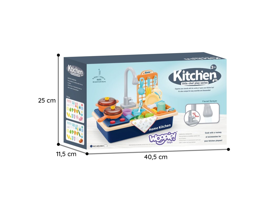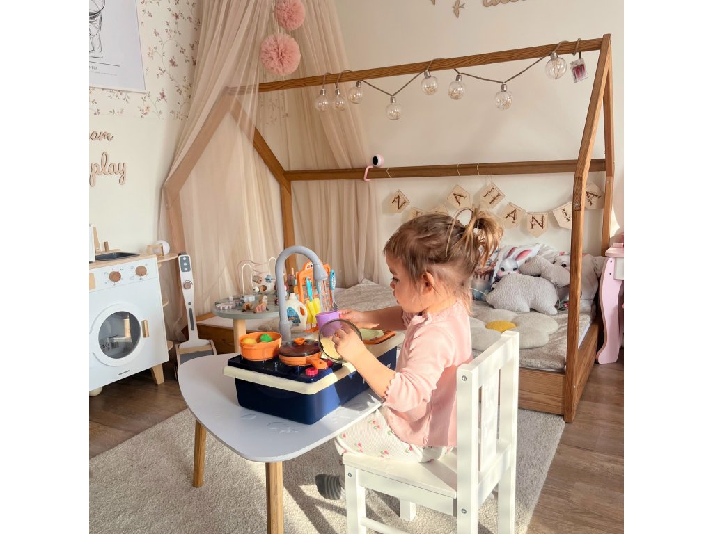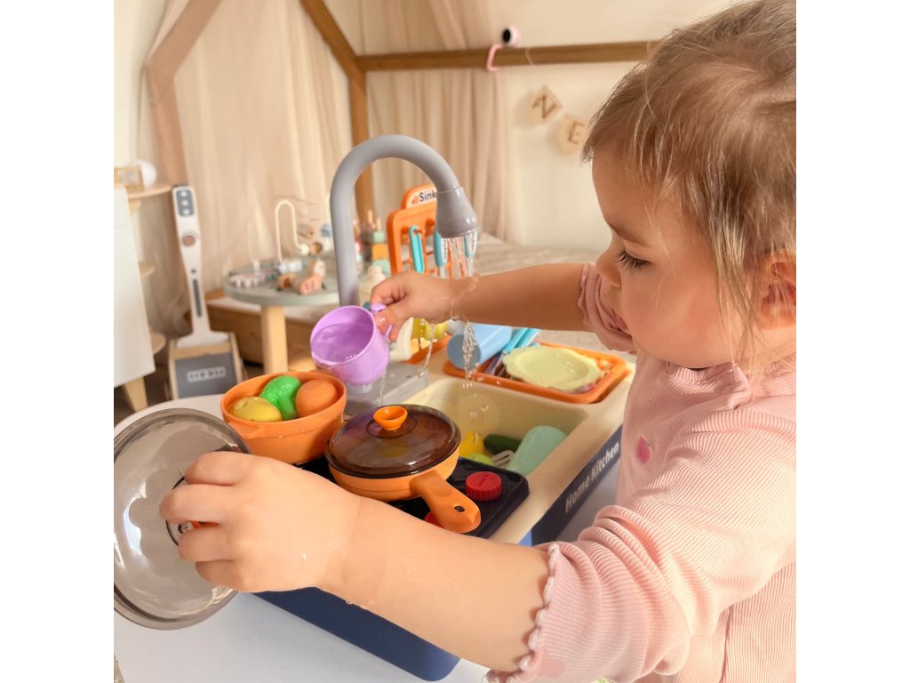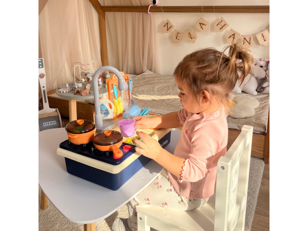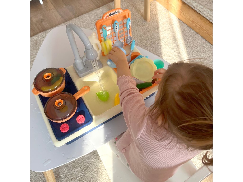 Drezový sporák 2v1 od značkyWOOPIEumožní deťom variť a umývať riad rovnako ako ich rodičia - napodobňovať od útleho veku! Hračka jedokonale reprodukovaný, vďaka čomu vaše dieťa nadobudne dojem, že vykonáva skutočné kuchynské činnosti. Mápohyblivé prvky ako sú kohútiky sporákov a kohútik, z ktorého saskutočná voda. Stačí naliať vodu do misky a pozorovať, ako sa dieťa hrá, a keď skončíte, jednoducho vyprázdnite spodnú misku. Okrem toho súprava obsahuje množstvo príslušenstva, ako naprhrnce ipotraviny. Hra na varenie, umývanie riadu a podobné práce pomáha deťom získať zmysel prezodpovednosti iautonómia.