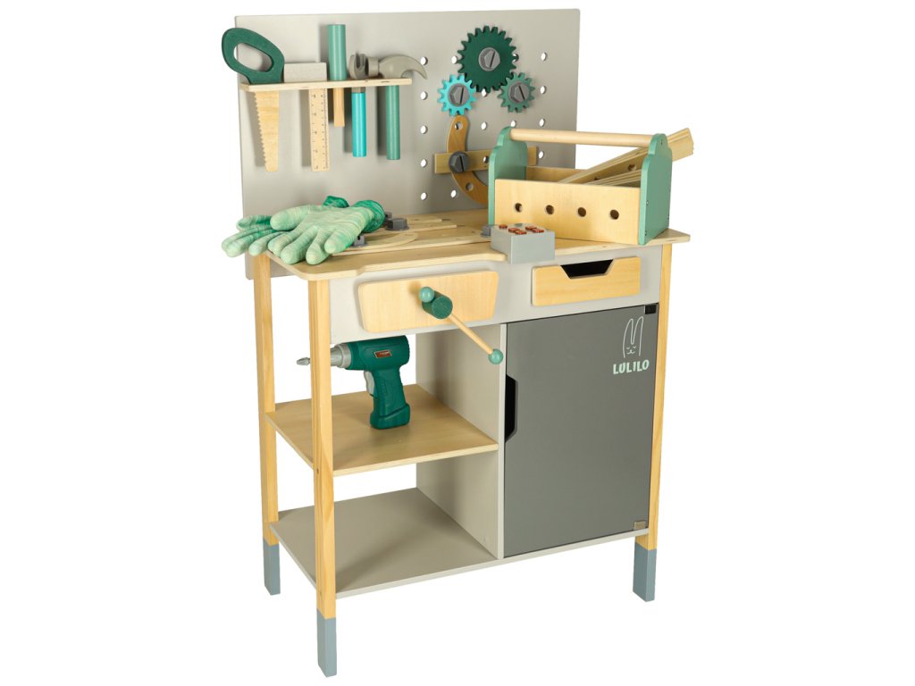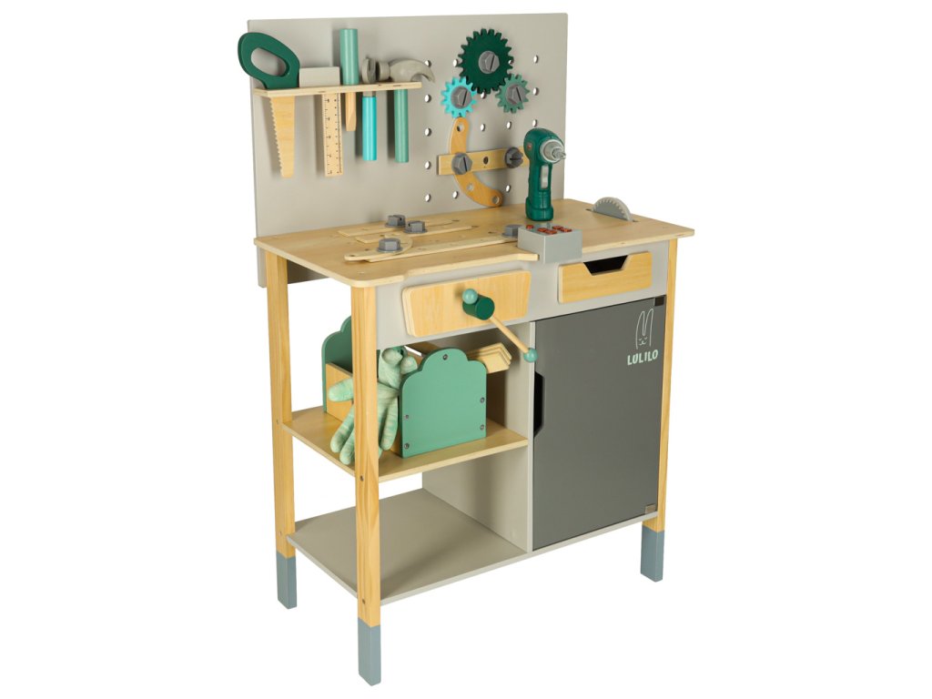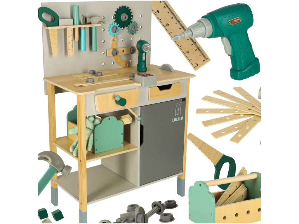 LULILO Fikso drevená dielňa malá sada pre domácich majstrov s náradím píla skrutkovač zvuky 86cm