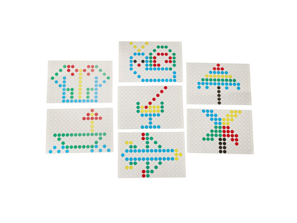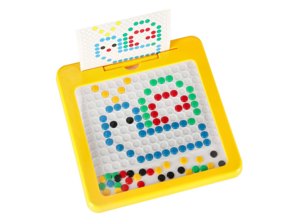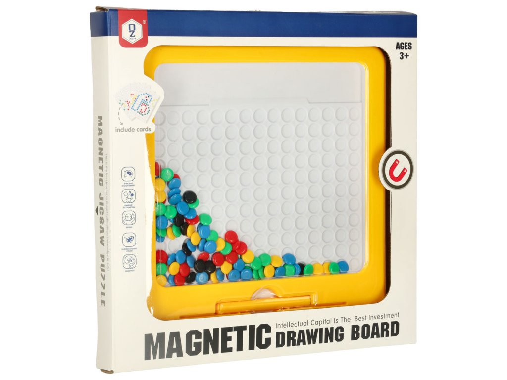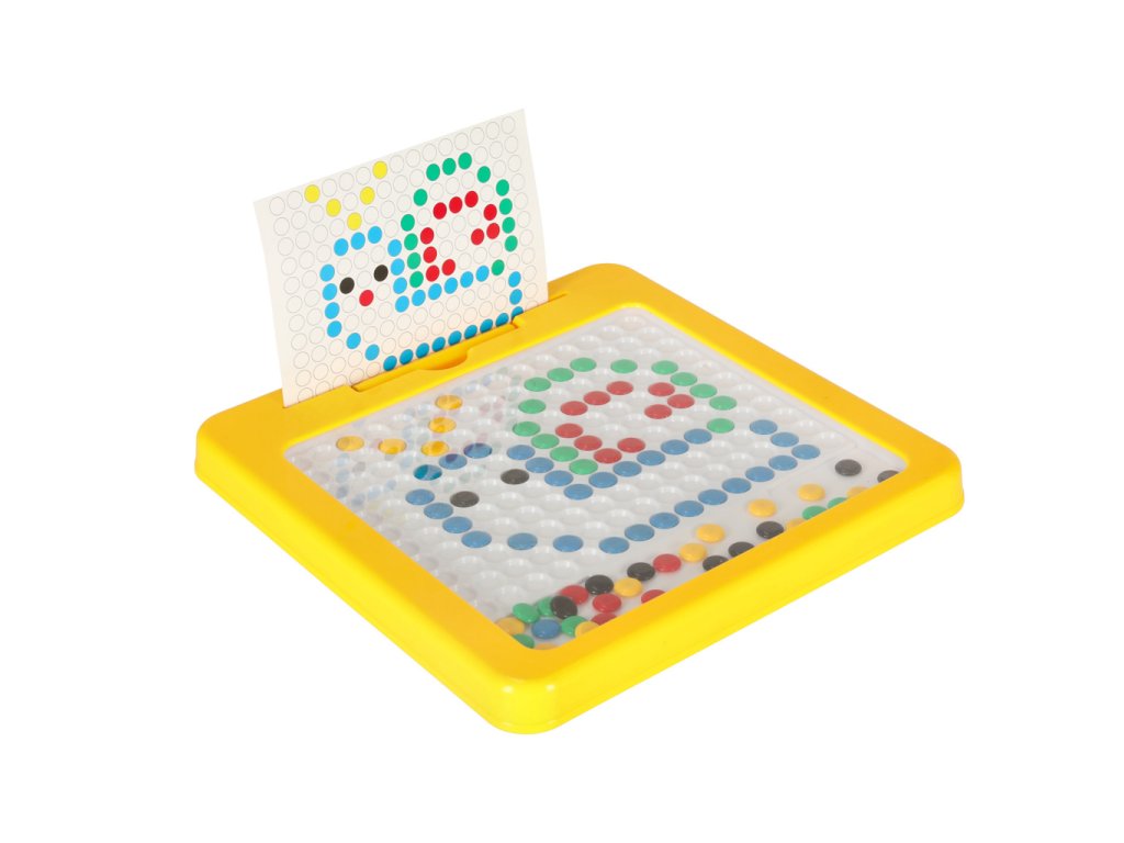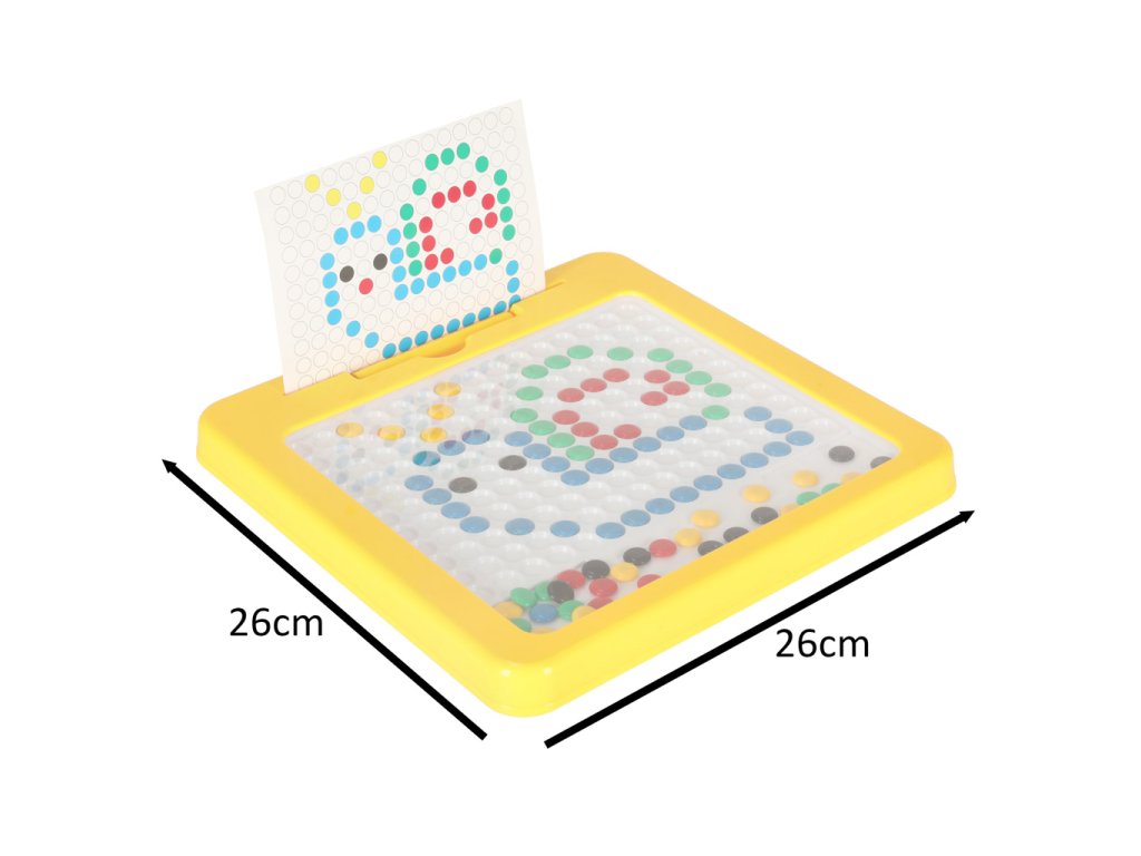 Tabuľa obsahuje farebné tlačidlá s malými magnetmi, ktoré môže vaše dieťa premiestňovať pomocou magnetického pera a vytvárať tak rôzne obrázky. Ak by vaše dieťa potrebovalo trochu inšpirácie, sada obsahujekartičky s ukážkovými vzormi na vytvorenie.