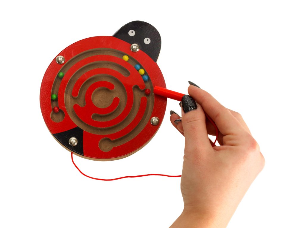 Zábavou je pomocou zmagnetizovaného stylusu presunúť farebné guľôčky na centrálne miesto.