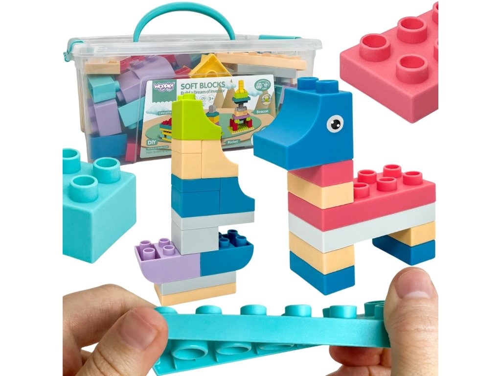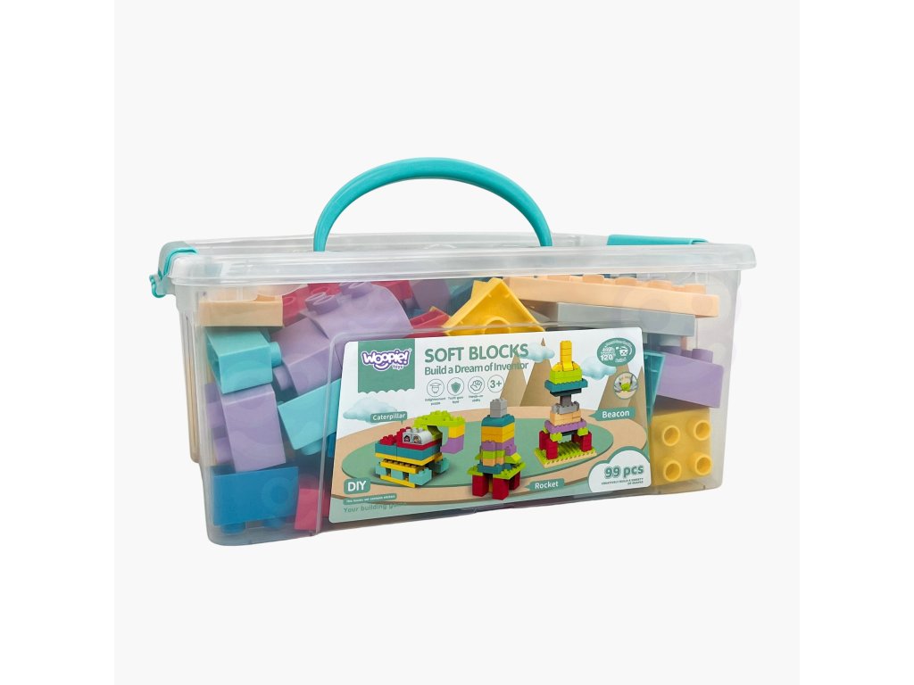 Doprajte svojmu dieťaťu tvorivú hru plnú radosti iučenie pomocou súboru mäkkých blokyMäkké bloky od značkyWoopie! Vďaka99 farebných prvkov batoľa si môže vytvoriť vlastnébudovy, vozidlá a fantastické stavby. Bezpečné,mäkký materiál sú vhodné aj pre najmenšie deti. Súprava je zabalená v praktickej uzatvárateľnej škatuli s rukoväťou, ktorá uľahčuje skladovanie a prenášanie. Je to ideálny darček na rozvoj predstavivosti a manuálnych zručností vášho dieťaťa!