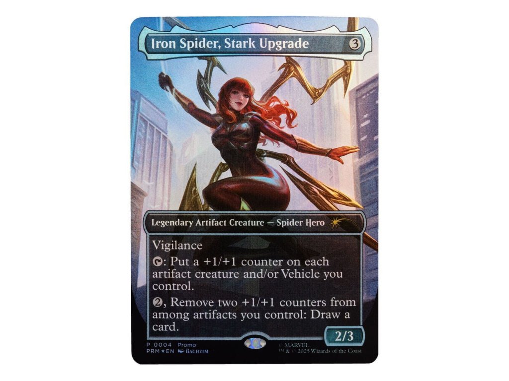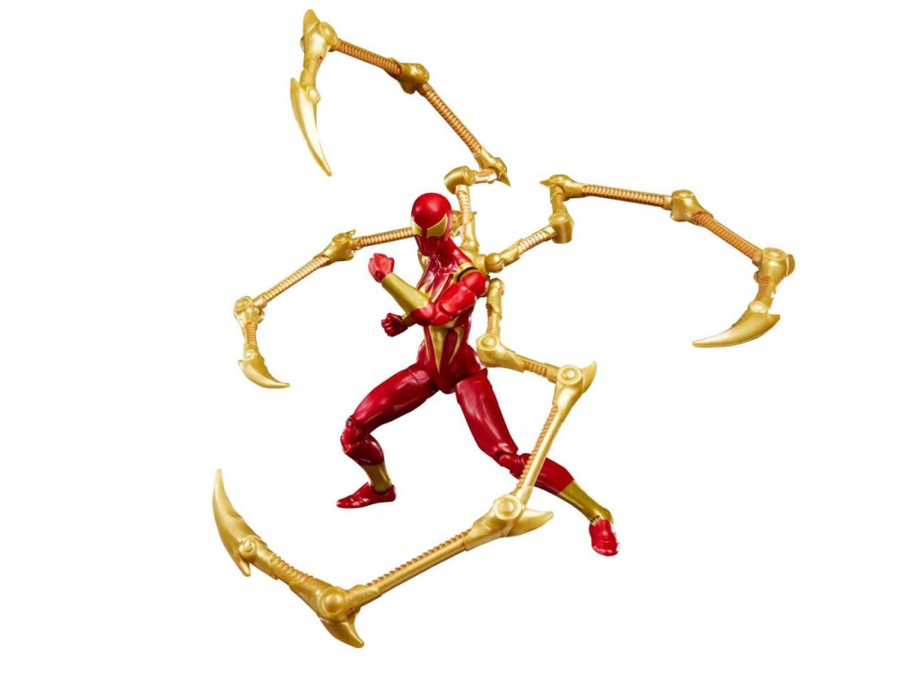 Veľkosť: 15 cm. Kĺbová figúrka. Obsahuje: obsahuje 1 alternatívnu hlavu s maskou, 2 ruky s pavučinou a 4 pohyblivé nohy z obleku Iron Spider. Obsahuje exkluzívnu kovovú kartu "Iron Spider, Stark Upgrade" pre obchodnú kartovú hru Magic: The Gathering.
