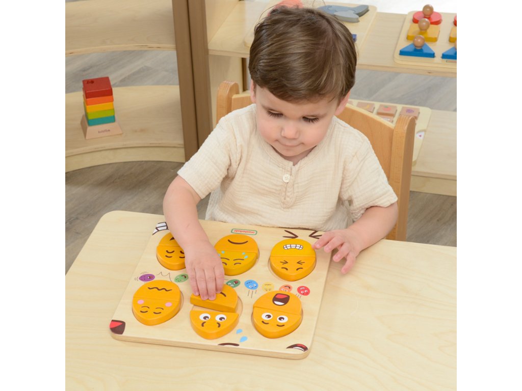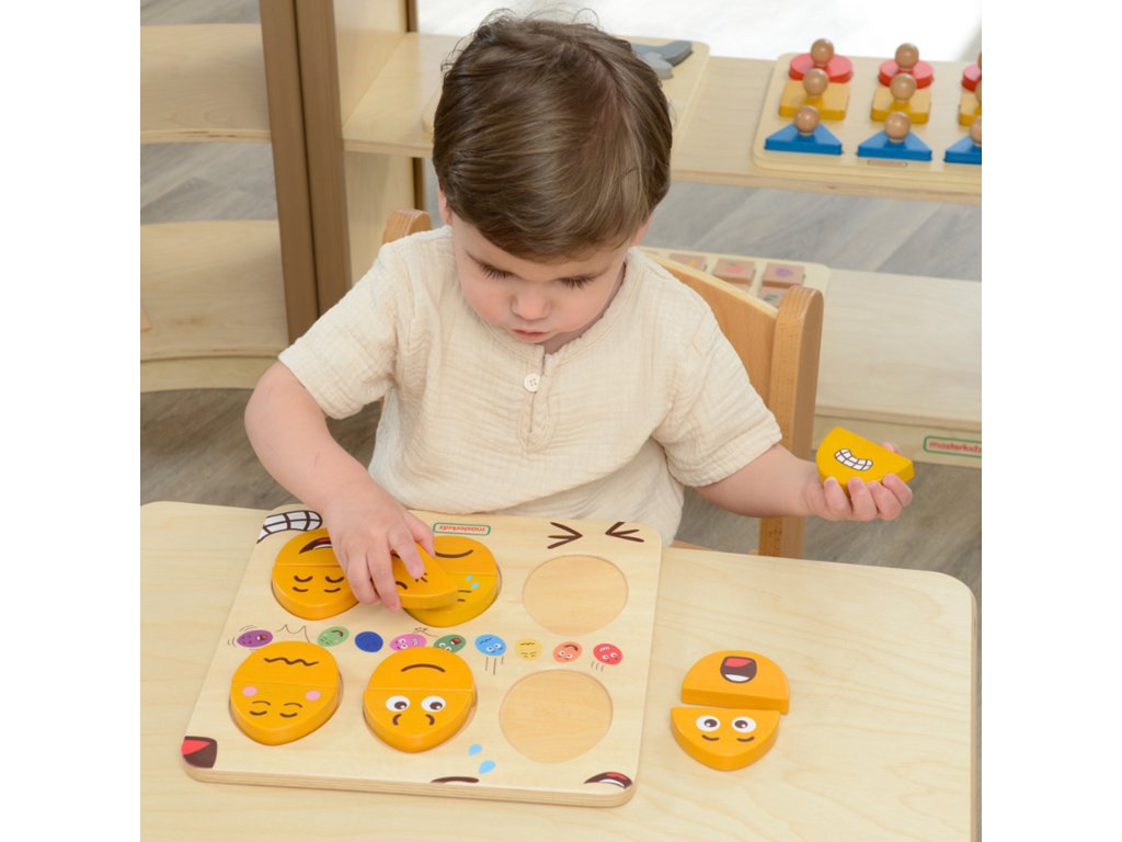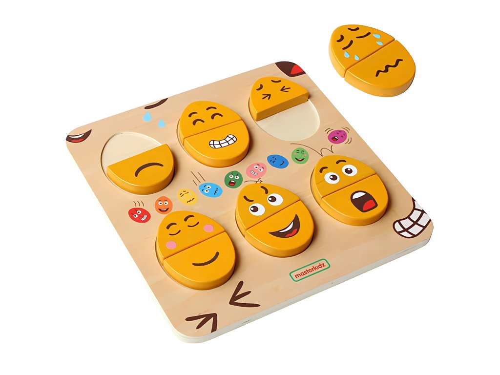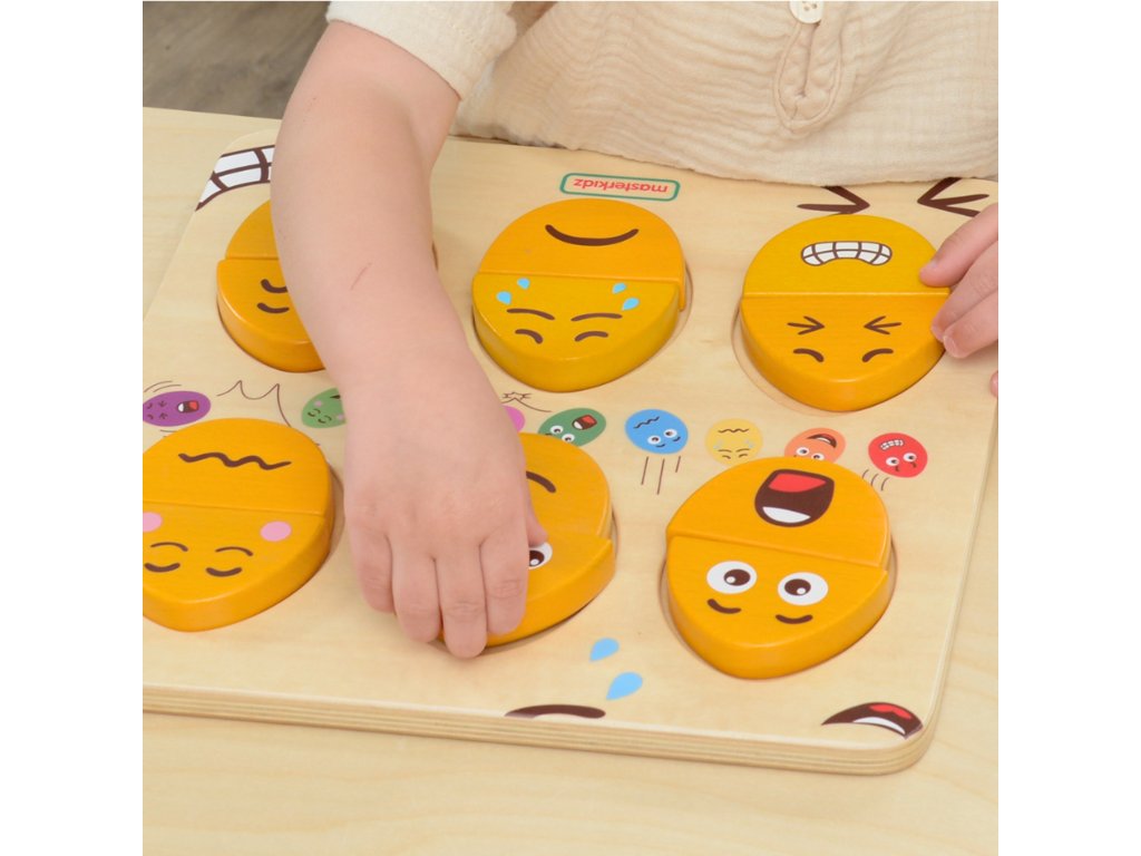 Drevená doska na učenie sa emóciám značkyMASTERKIDZ.Tabuľa je navrhnutá tak, aby pomáhala deťom rozvíjať emocionálne povedomie a sociálne zručnosti. Deti môžu kombinácia hornej a dolnej časti rôznymi spôsobmi, aby ste získali výrazy tváre. Je to obzvlášť užitočný nástroj na povzbudenie detí, abyneverbálne vyjadrovanie pocitov. Môže sa používať aj ako nástroj naučenie detí o empatiia požiadajte ich, aby pomocou týchto blokov odhadli alebo zmapovali pocity ostatných.
