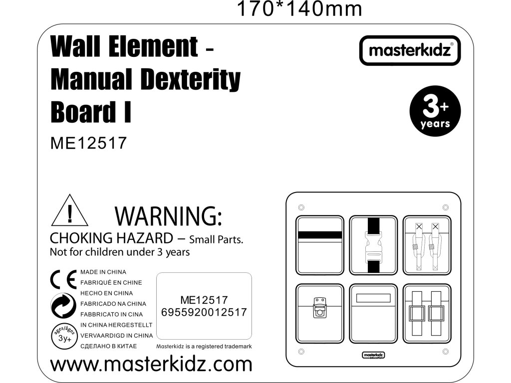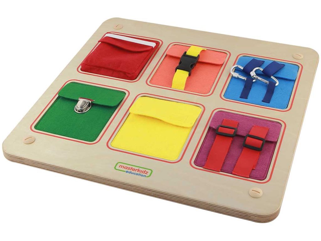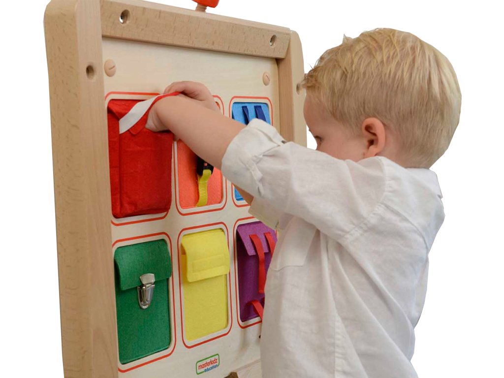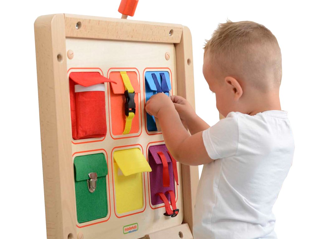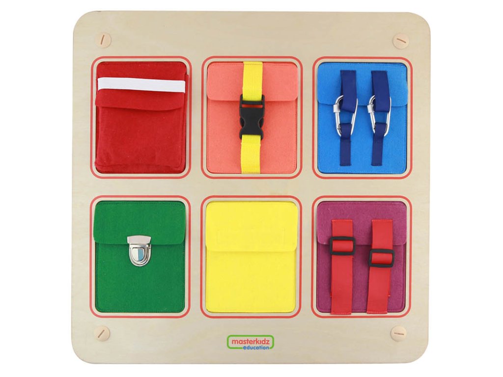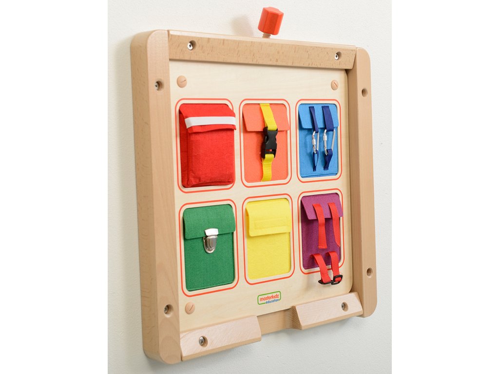 Nástenná tabuľa od spoločnosti Masterkidz, ktorú možno namontovať na stenu alebo do systému Masterkidz Flex. Na tabuli je zobrazených 6 farebných textilných vreciek, ktoré sa uzatvárajú pomocou rôznych uzáverov a zámkov. Dieťa sa pomocou nich môže naučiť otvárať a zatvárať rôzne typy uzáverov.