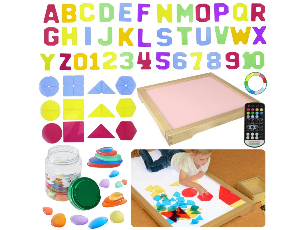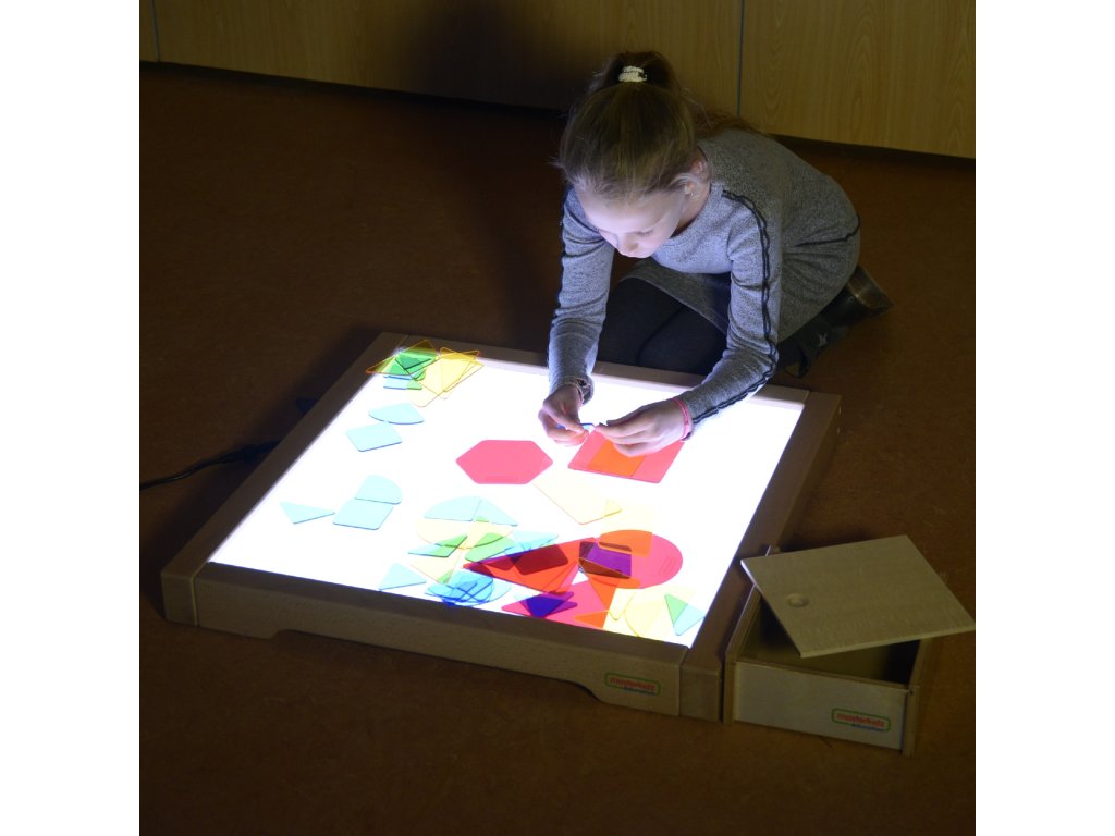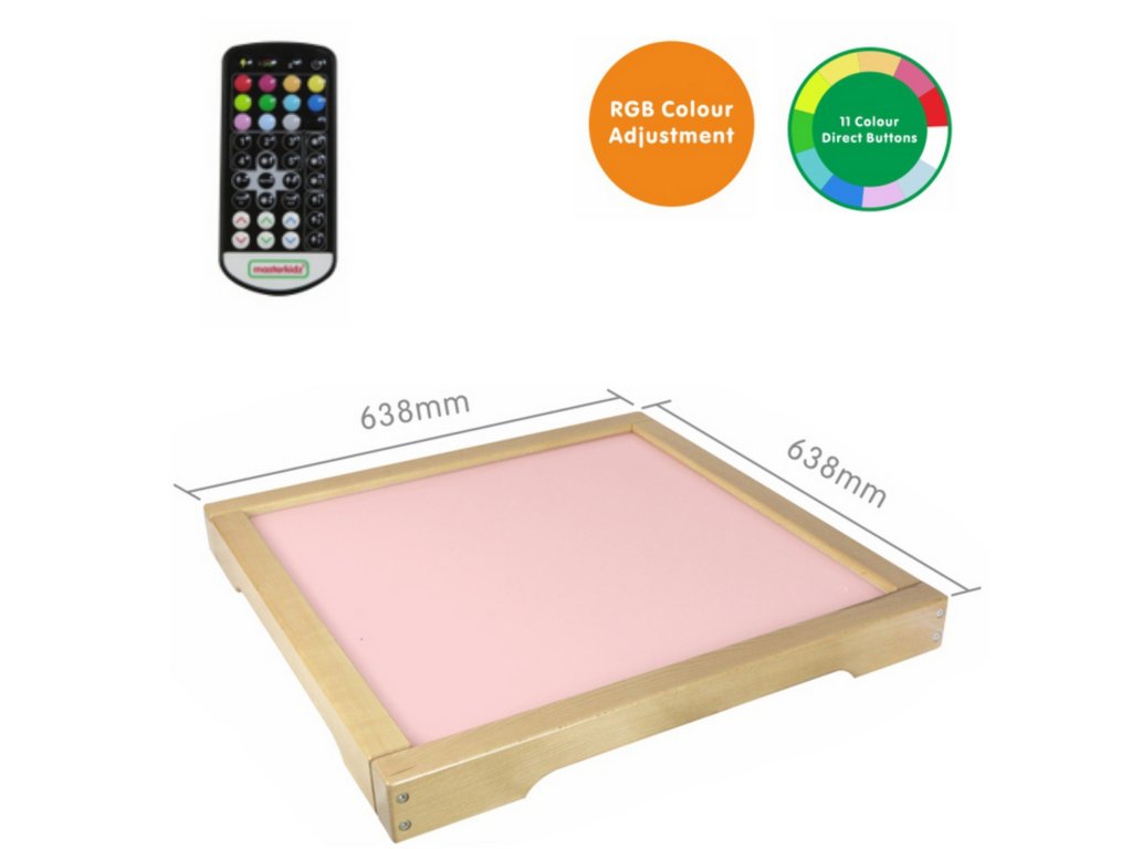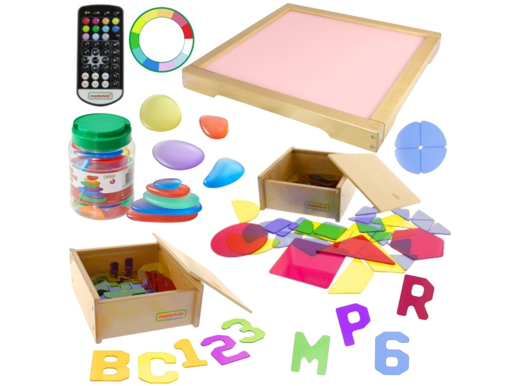 Panel Masterkidz LED Sensory Box je masívna drevená skrinka s LED podsvietením vyžarujúcim farebné svetlo s možnosťou ľubovoľnej konfigurácie vďaka priloženému diaľkovému ovládaniu, používateľ môže panel nastaviť na jednu z 11 naprogramovaných farieb alebo ručne meniť vyžarovanú farbu na základe základných farieb svetla: červenej, zelenej a modrej. Zariadenie umožňuje aj plynulé prechody medzi farbami a ukladanie vybraných farieb na opakované použitie. Svetelný panel s LED diódami umožňuje rôzne aktivity na podporu kreativity, napríklad miešanie farieb a učenie STEM. Pôsobivé výsledky sa dosiahnu, keď svetlo presvieti rôzne materiály - listy, papier, zásobník s pieskom alebo priehľadnú vodu. Panel dokonale spolupracuje s priloženým farebným príslušenstvom, ktoré obohacuje možnosti hry a učenia a umožňuje vytvárať rôzne vzory a kompozície vo svetle.