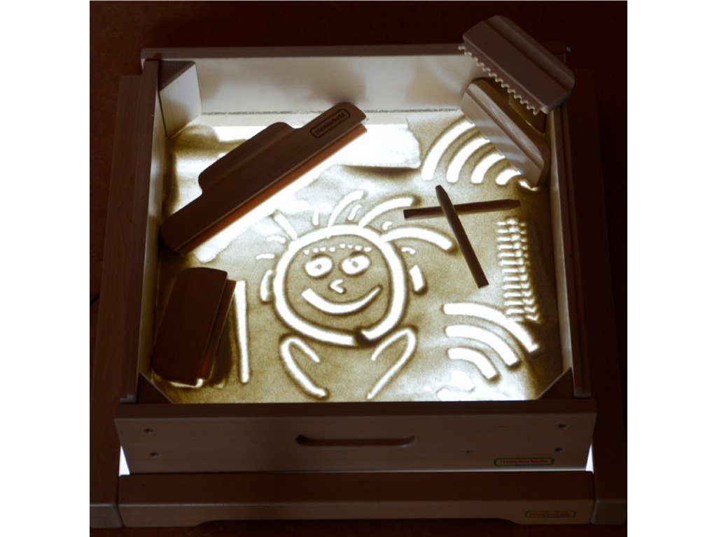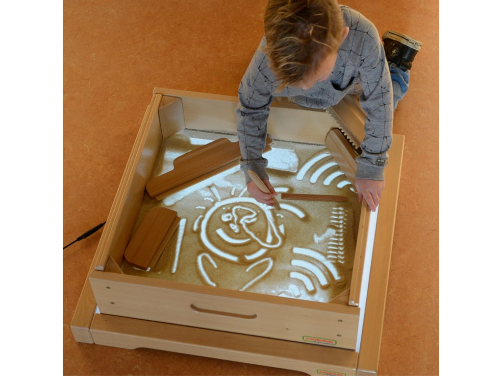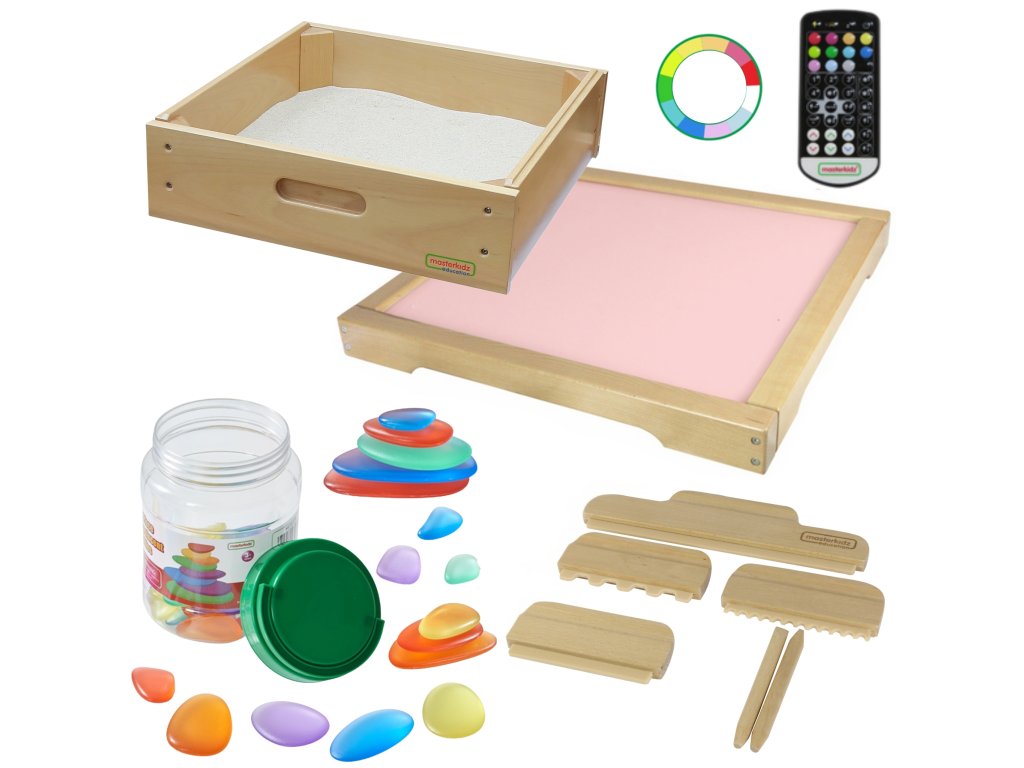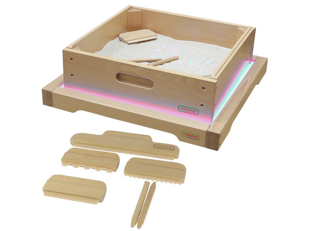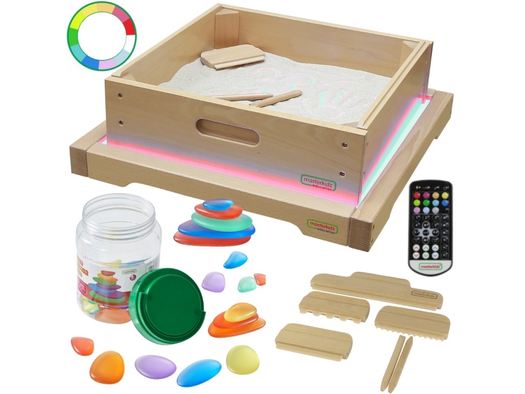 Panel Masterkidz LED Sensory Box je masívna drevená skrinka s LED podsvietením vyžarujúcim farebné svetlo s možnosťou ľubovoľnej konfigurácie vďaka priloženému diaľkovému ovládaniu, používateľ môže panel nastaviť na jednu z 11 naprogramovaných farieb alebo ručne meniť vyžarovanú farbu na základe základných farieb svetla: červenej, zelenej a modrej. Zariadenie umožňuje aj plynulé prechody medzi farbami a ukladanie vybraných farieb na opakované použitie. Svetelný panel s LED diódami umožňuje rôzne aktivity na podporu kreativity, napríklad miešanie farieb a učenie STEM. Pôsobivé výsledky sa dosiahnu, keď svetlo presvieti rôzne materiály - listy, papier, zásobník s pieskom alebo priehľadnú vodu. Panel dokonale spolupracuje s priloženým štvorcovým zásobníkom na hranie s pieskom a farebnými kamienkami, ktoré ešte viac umocňujú zmyslový zážitok.