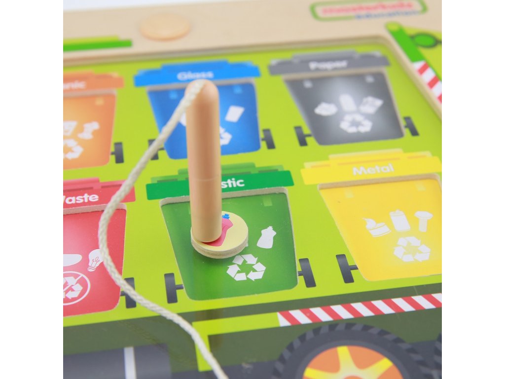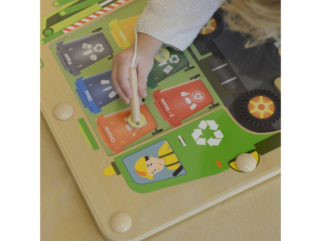 Senzorická vzdelávacia hračka pre deti. Drevená tabuľa značky Masterkidz s výučbou triedenia odpadu. S magnetická tyč, Úloha dieťaťa umiestnenie krúžkov na odpadky do príslušných nádob.