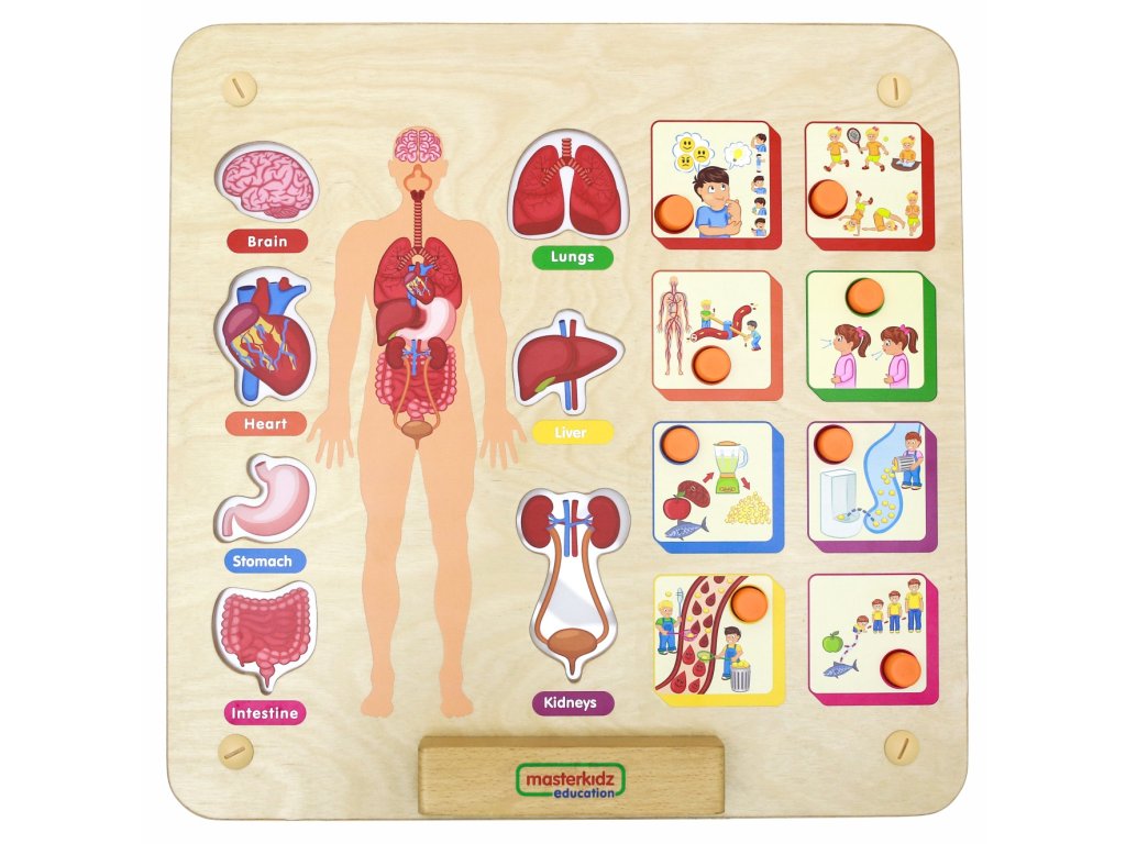 - - tabuľa jednoduchým spôsobom vysvetľuje deťom, ako fungujú jednotlivé orgány v tele, napr. mozog riadi myslenie, emócie a zmysly, srdce pumpuje krv do celého tela, pľúca pomáhajú dýchať, žalúdok pomáha rozkladať potravu, črevá pomáhajú tráviť potravu