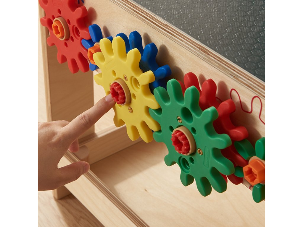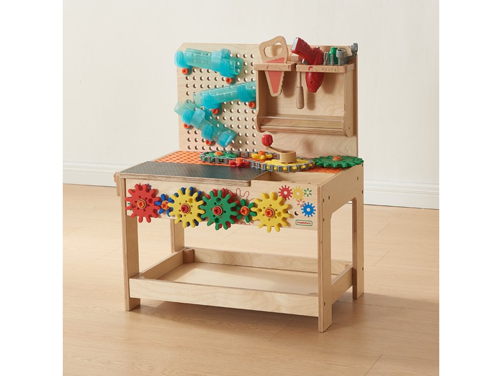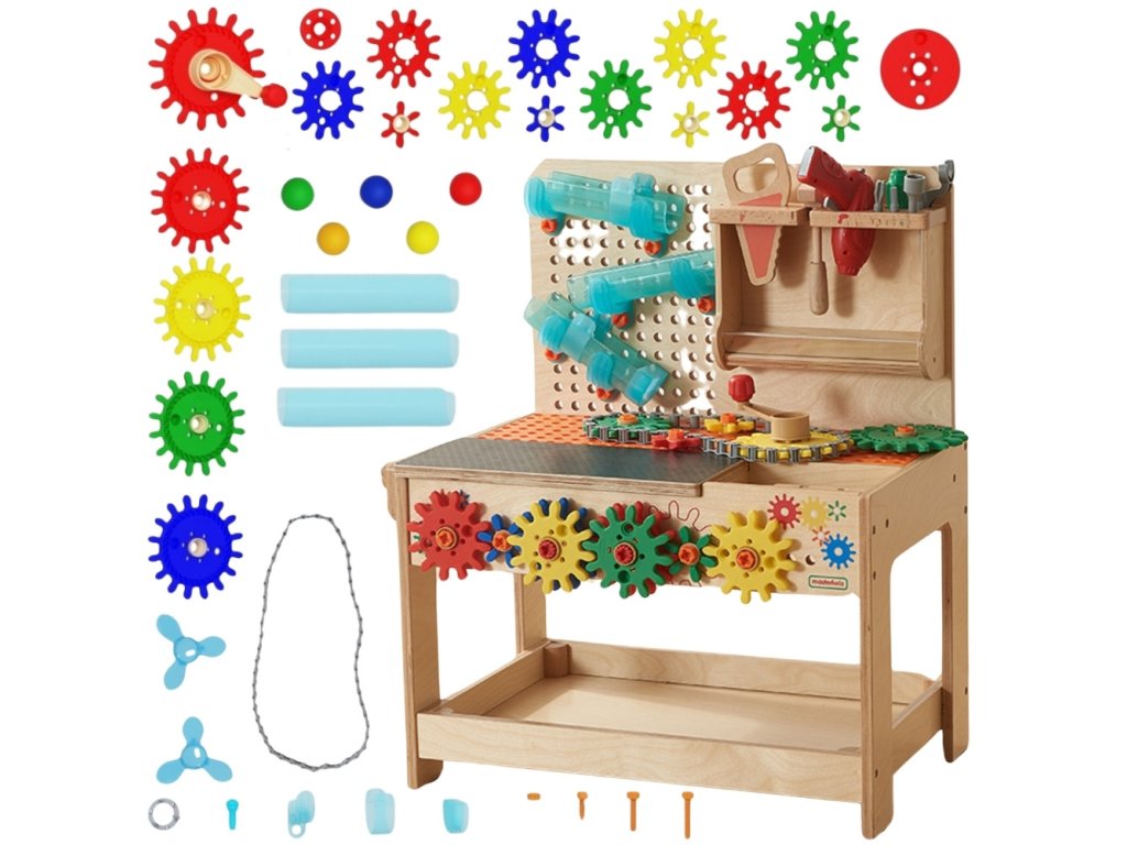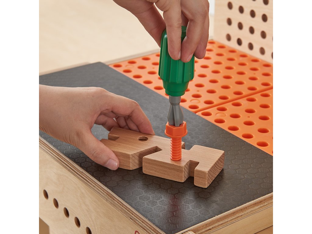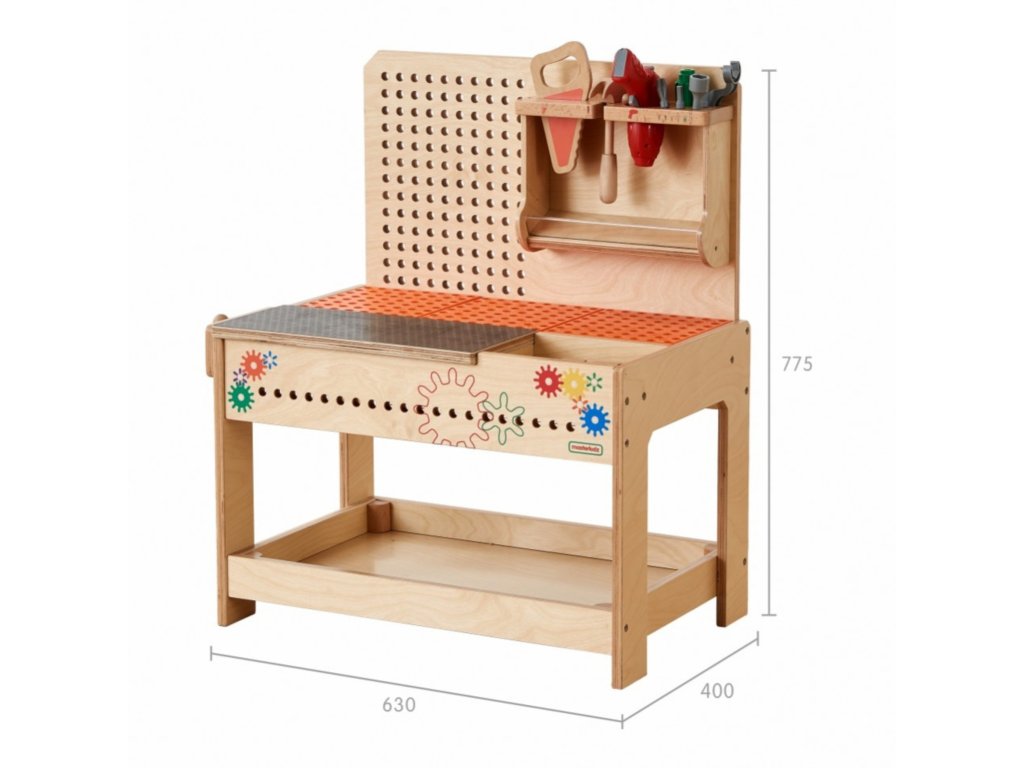 Drevený vzdelávací workshop STEM umožňujú tvorivú hru a spoznávanie sveta vedy. Stôl má panel s otvormi, do ktorých môžete vložiť farebné a geometrické kolíky, skrutky, ozubené kolesávedecké experimenty a krásne návrhy. Vrchnák vysoký 42,5 cm je vhodný pre deti od 3 rokov. Deti budú chcieť vytvárať skutočné fungujúce logické systémy s realistickými nástrojmi.