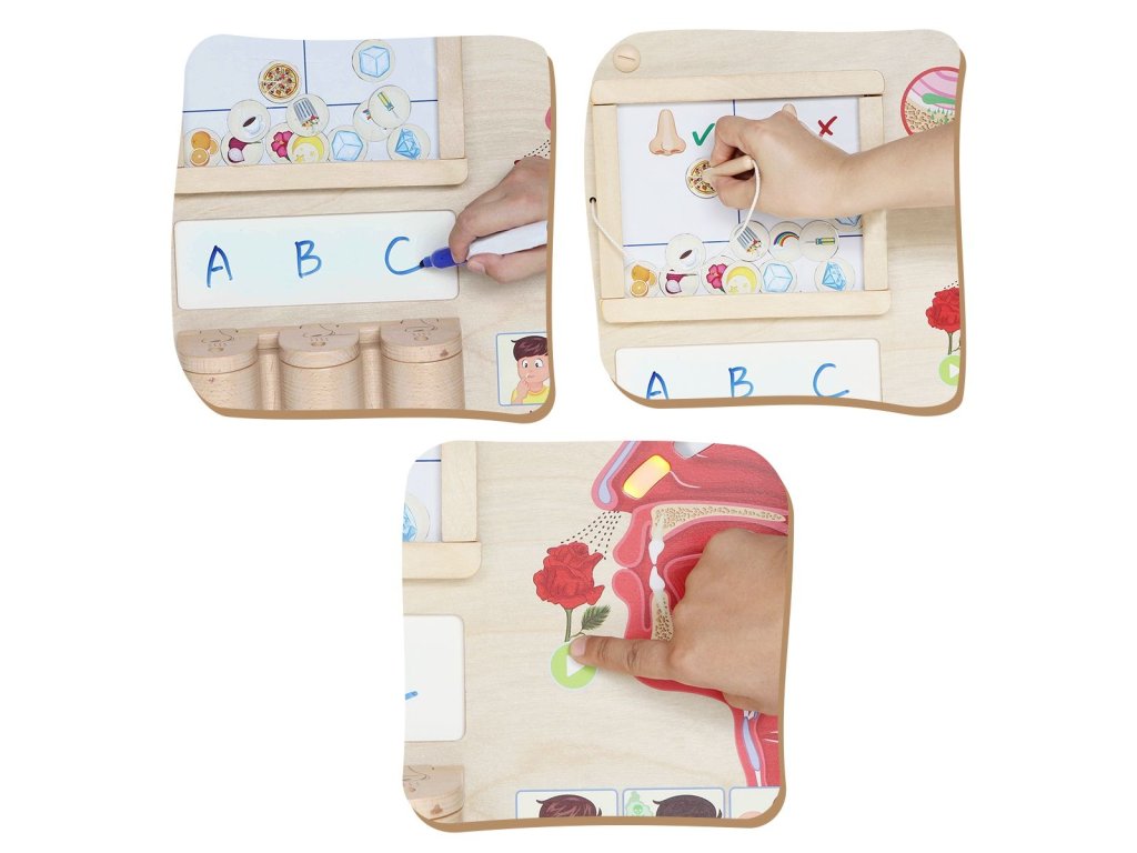 - - keď sa dieťa dotkne kvetu, uvidí simulovaný tok vône z kvetu do nosa, vysvetlite dieťaťu, ako nos vníma vôňu a potom sa mení na signál, ktorý sa prenáša z nosa do mozgu (zobrazené pomocou LED diód)
