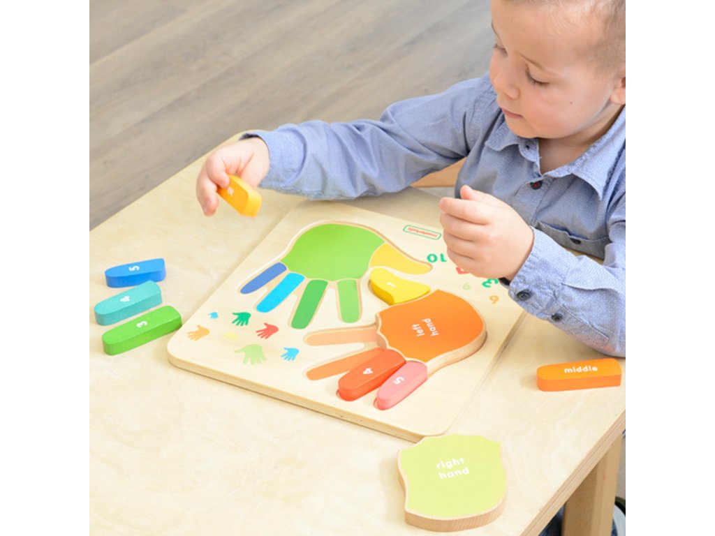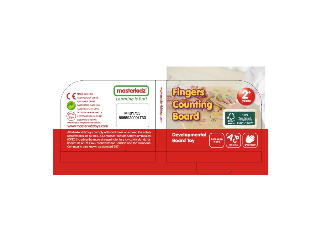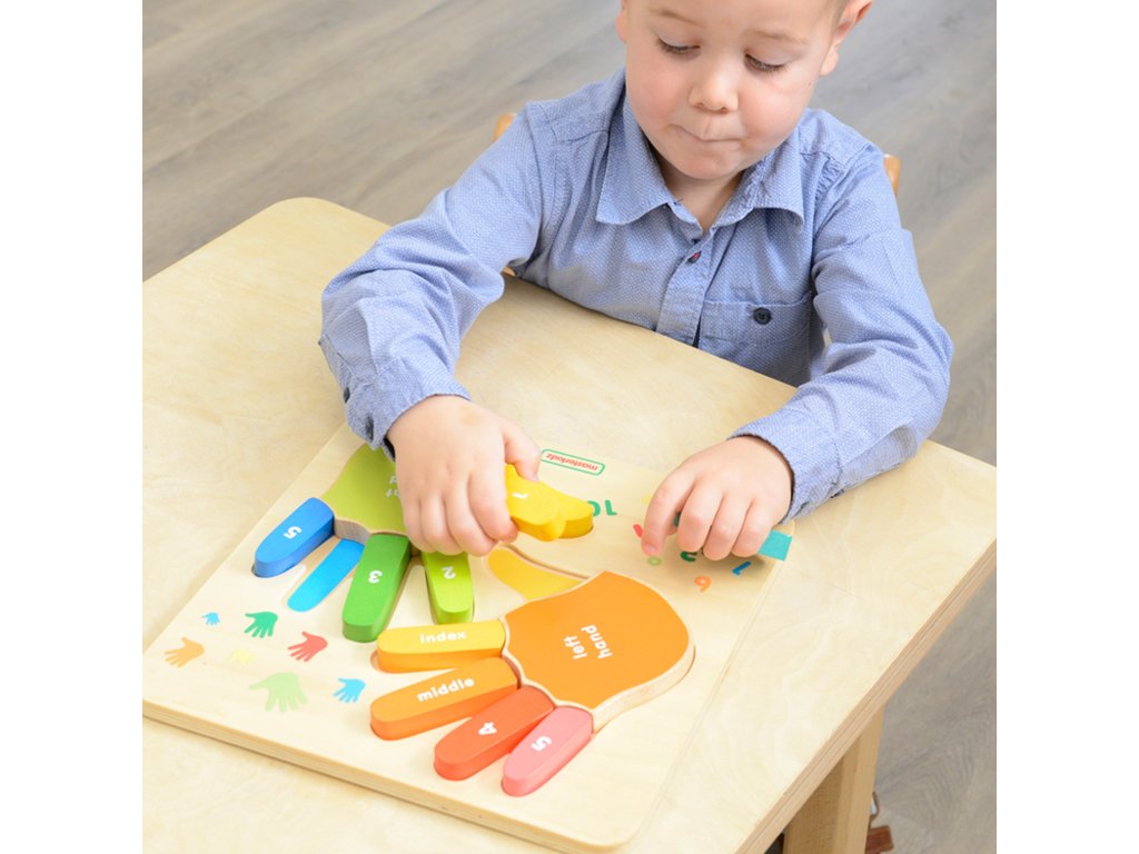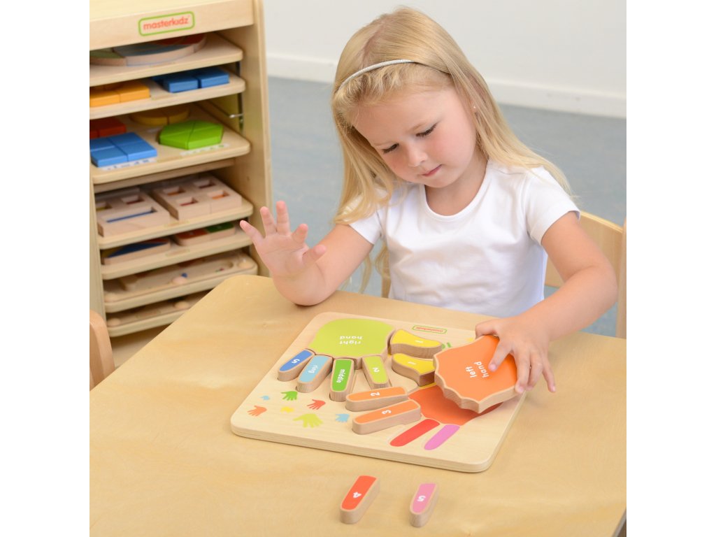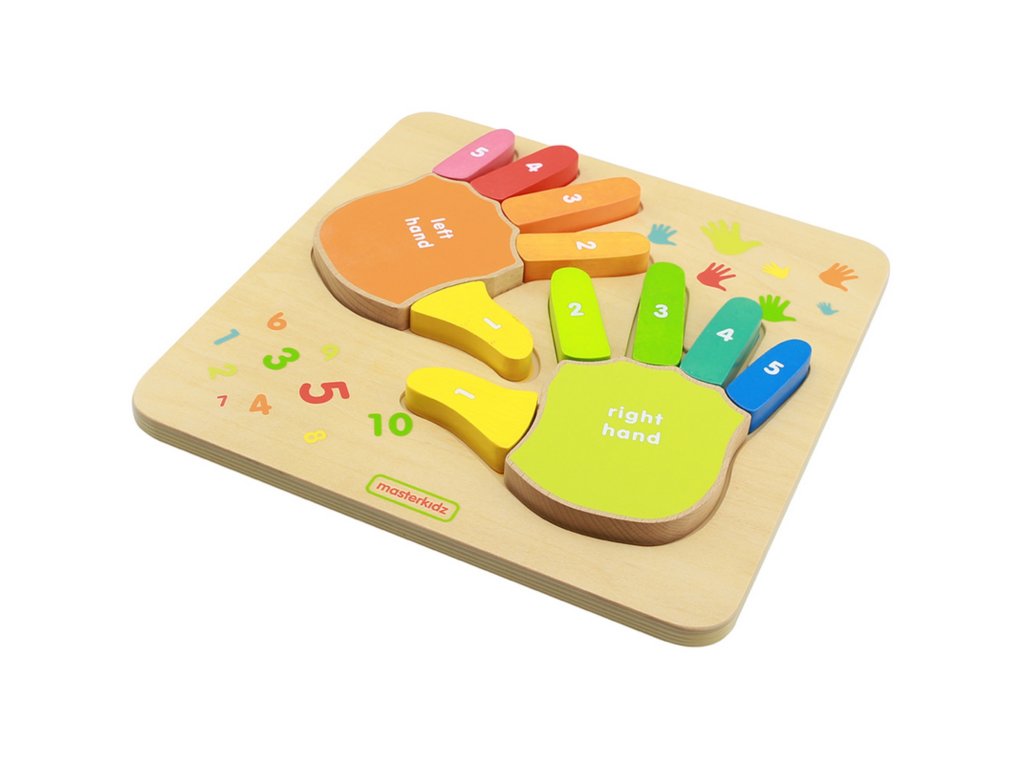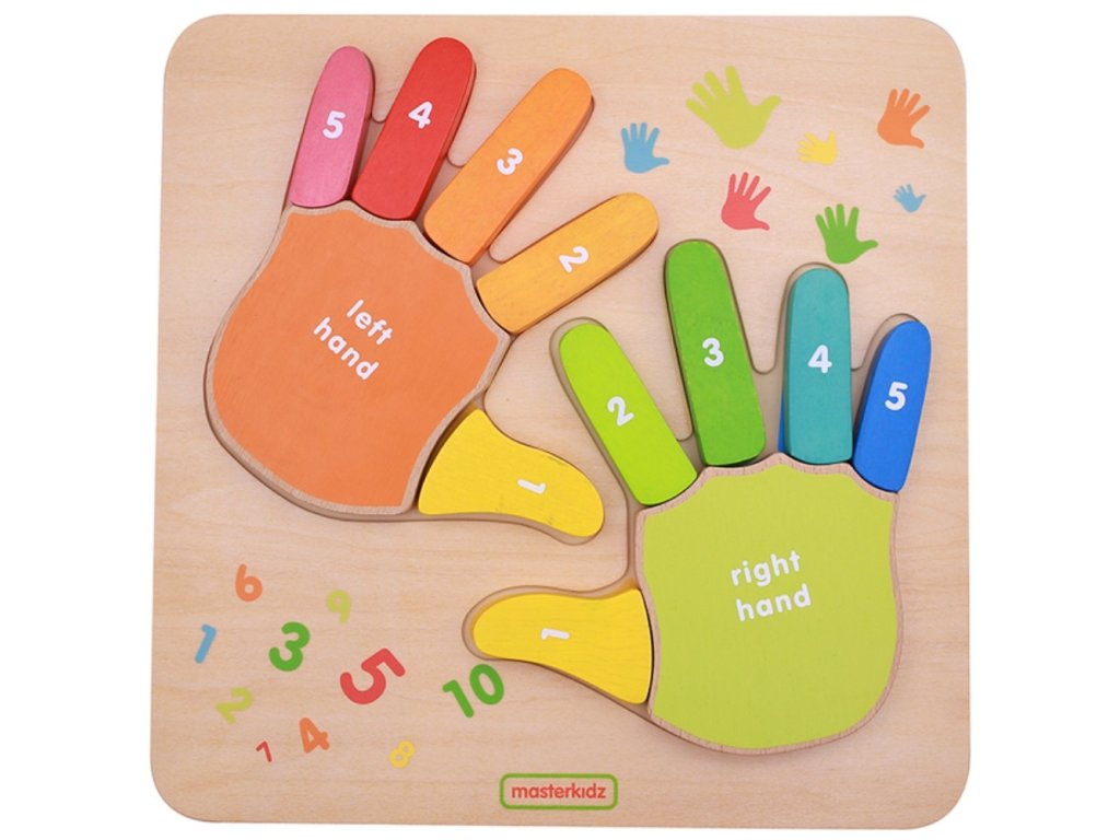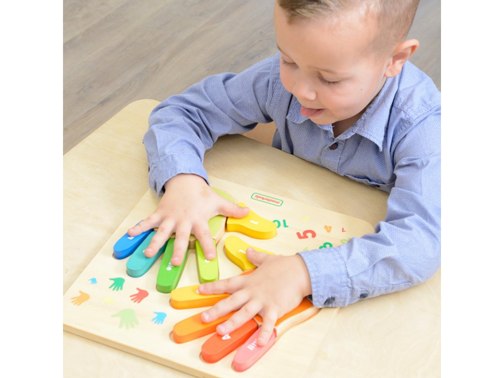 Drevený počítací stolík na výučbu počítania prstami značkyMASTERKIDZ je skvelou pomôckou pre batoľatá, ktoré začínajú svoje matematické dobrodružstvo. Farebné ruky na doske sú presne označené názvami prstov a pravej a ľavej strany. Ku každému z prstov je priradené aj číslo, takže dieťa môže získané vedomosti po pochopení princípu pretaviť do počítania na vlastných prstoch.