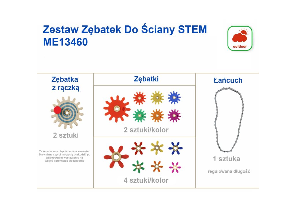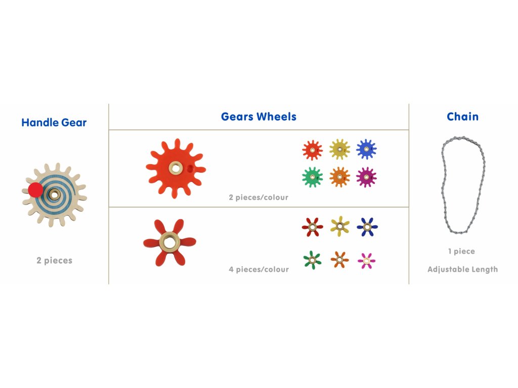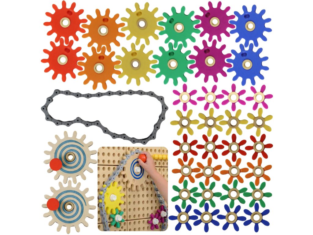 Súprava farebných ozubených koliesok a prevodov Masterkidz poskytuje deťom jednoduchý prístup k skutočným, fungujúcim strojárskym súčiastkam. Každé ozubené koliesko obsahuje centrálne ložisko, ktoré sa po pripojení naďalej plynulo otáča. Zaoblené konce zubov uľahčujú spojenie koliesok v priamej línii alebo dokonca v uhle 90 stupňov voči sebe. Rôzne veľkosti kolies umožňujú deťom pochopiť princípy prevodových pomerov a reťazové koleso umožňuje prenos rotačnej sily. Súprava je kompatibilná s doskami STEM