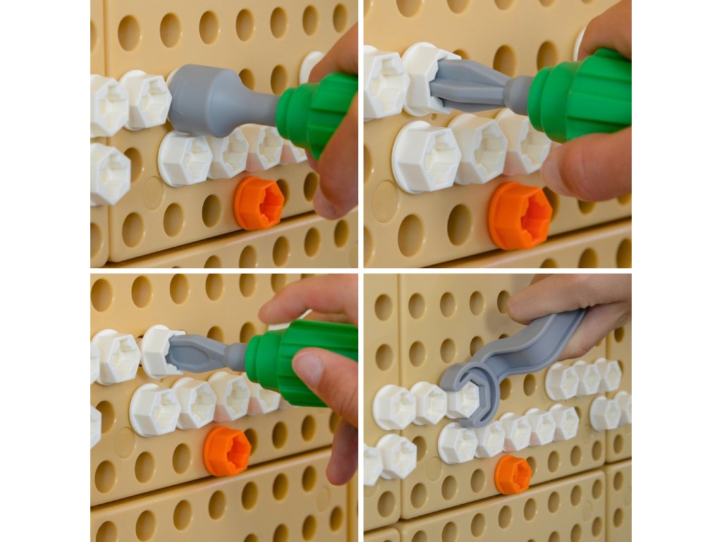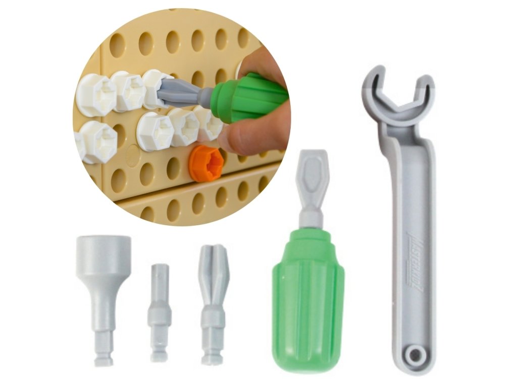 Praktická sada nástrojov pre deti, vďaka ktorej bude hra so stenou Masterkidz STEM oveľa zaujímavejšia! Obsahuje skrutkovač so 4 vymeniteľnými bitmi a kľúč. Nástroje sa používajú na uťahovanie a povoľovanie skrutiek Masterkidz. Hračka precvičuje motorické zručnosti detí a učí ich správne používať základné nástroje.
