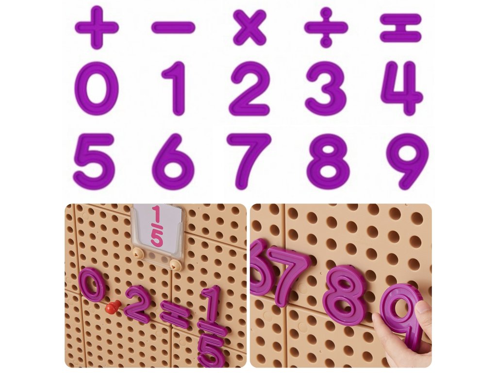Súprava 82 kusov čísel na učenie počítania je sada, ktorá je vynikajúcim nástrojom pre deti na učenie sa matematiky. Obsahuje 40 čísel, ako aj symboly pre matematické operácie a rovnice, ktoré umožňujú vytvárať jednoduché aritmetické operácie. Dieliky súpravy sú dostatočne veľké, takže sa ľahko držia a spájajú, a ich fialová farba je pútavá. Súprava sa dokonale hodí na steny STEM. Pomáha pri výučbe počítania, zmyslu pre čísla a vykonávaní základných matematických operácií, ako je sčítanie, odčítanie, násobenie a delenie. Je to skvelý nástroj na podporu rozvoja matematických zručností u malých žiakov.