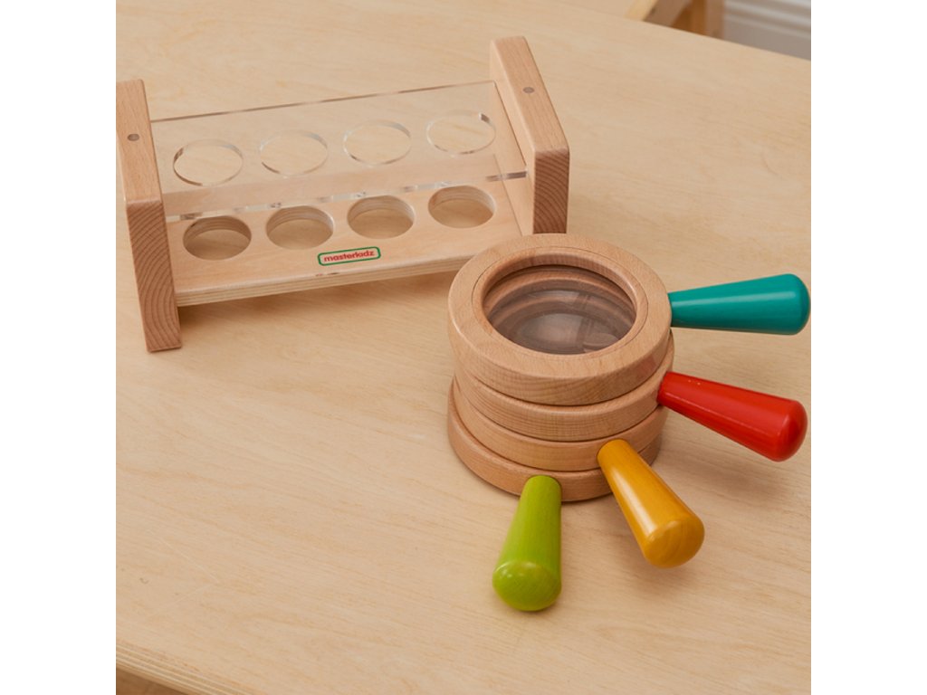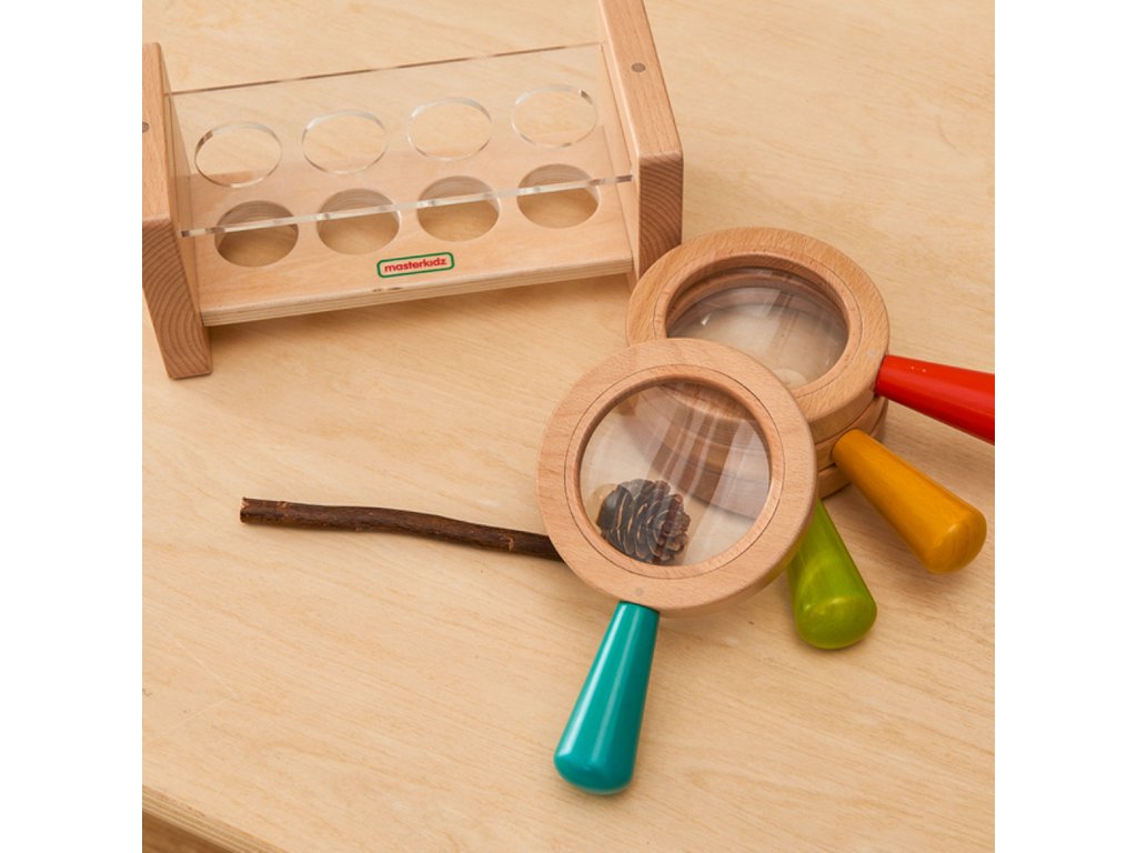 Nechajte svoje dieťa premeniť sa na malého objaviteľa s touto jedinečnou sadou lupy s dreveným stojanom! Súprava obsahuještyri robustné lupy s veľkými priehľadnými zväčšovacími šošovkami, ktoré sú ideálne na skúmanie rastlín, hmyzu alebo iných prírodných pokladov. Každá lupa máergonomická drevená rukoväť v pestrých farbách (červená, zelená, žltá a modrá), vhodné pre malé ruky.