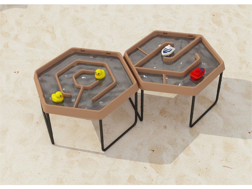 Značka šesťuholníkového vodného bludiskaMasterkidz je neobyčajný priestor na hranie, kde sa deti môžu nechať unášať loďkami a kačicami po kľukatých kanáloch a sledovať, ako voda tečie a mení smer. Stabilný kovový rám s nastaviteľnou výškou a vanička s vodnými dráhami vytvárajú atraktívne, priestranné miesto na experimenty, tematické hry a spoločnú zábavu.