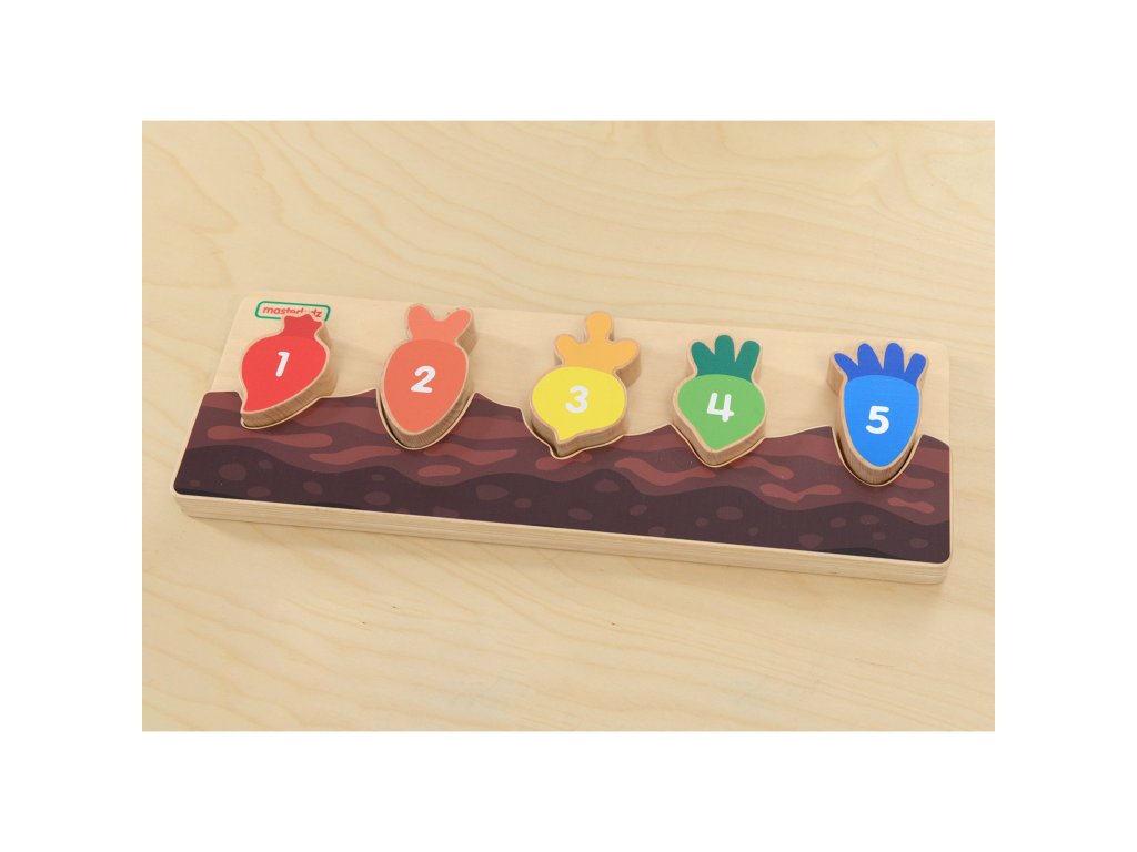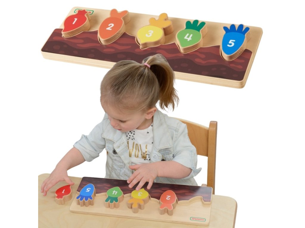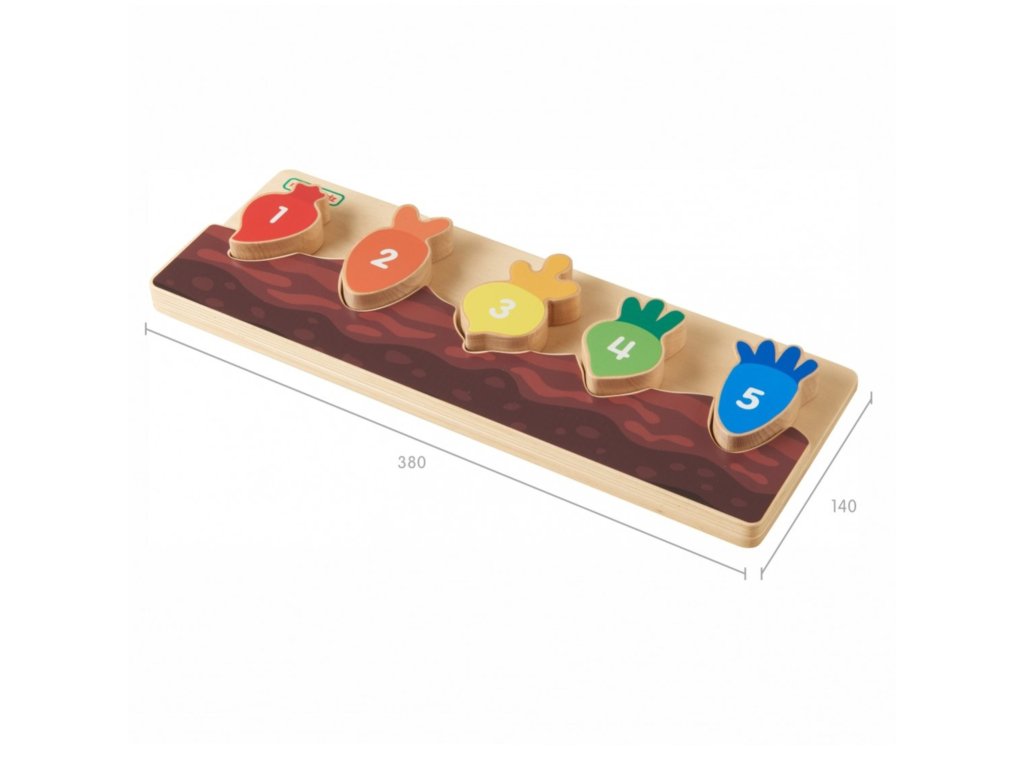 - - 5 x farebná koreňová zelenina (vrátane mrkvy, červenej repy, repy) v červenej, oranžovej, žltej, zelenej a modrej farbe. Každá zelenina je zreteľne označená číslom, ktoré zavádza prvok učenia sa počítania.