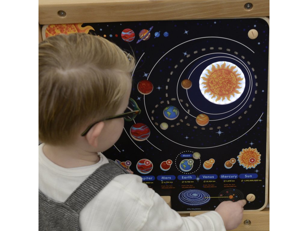 - - Keď dieťa v spodnej časti stlačí jednu z planét - daná planéta v slnečnej sústave sa rozsvieti (dieťa bude vedieť, ktorá planéta má akú pozíciu)