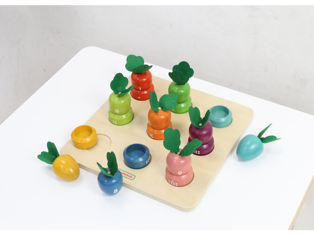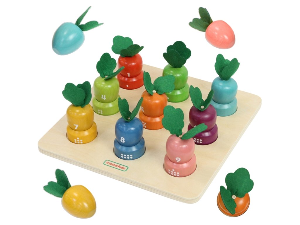 Drevená doska na učenie čísel a farieb zznačkyMASTERKIDZ.Tabuľa je navrhnutá tak, aby pomáhala deťom rozvíjať ich zmysly. Deti musia zodpovedaťsprávna zelenina pre počet bodova farba. Usporiadané sa bude vyvíjať, tiež dokonalemanuálne zručnosti u dieťaťa tzv."malé motorické zručnosti".