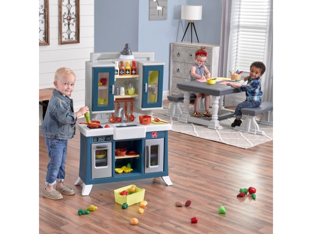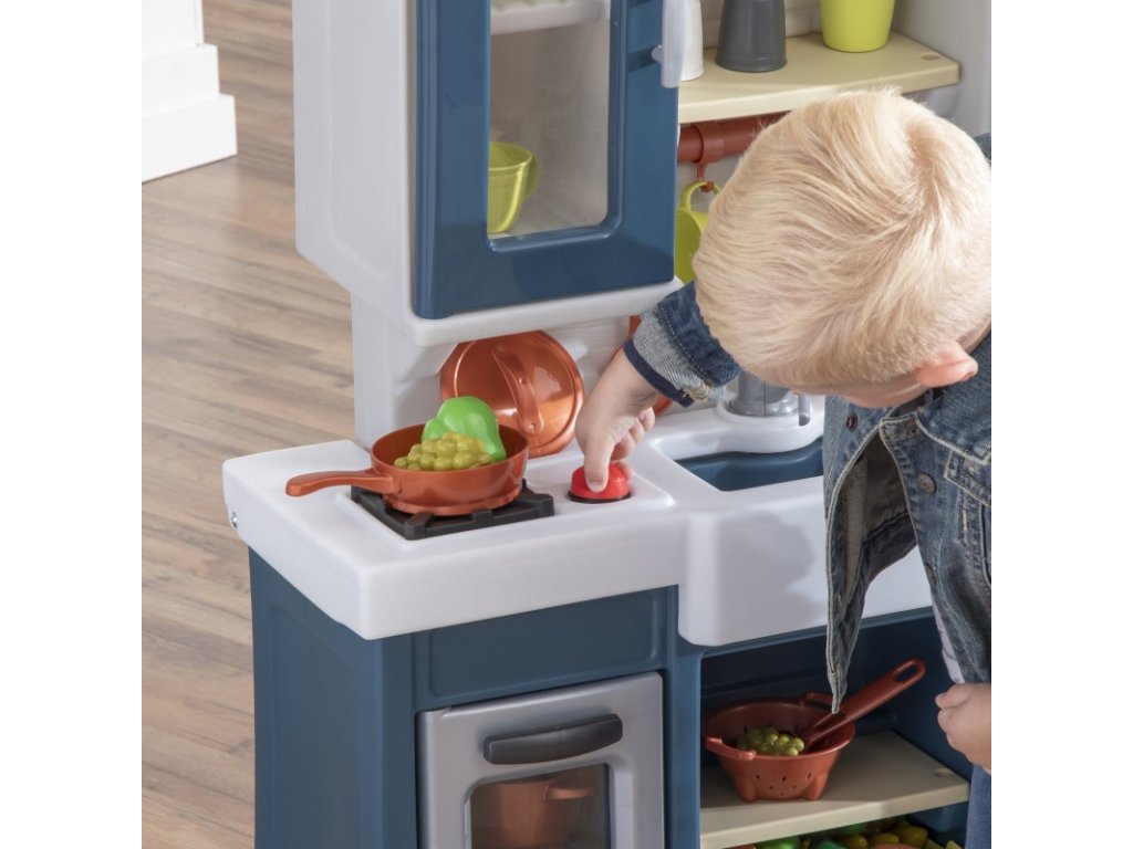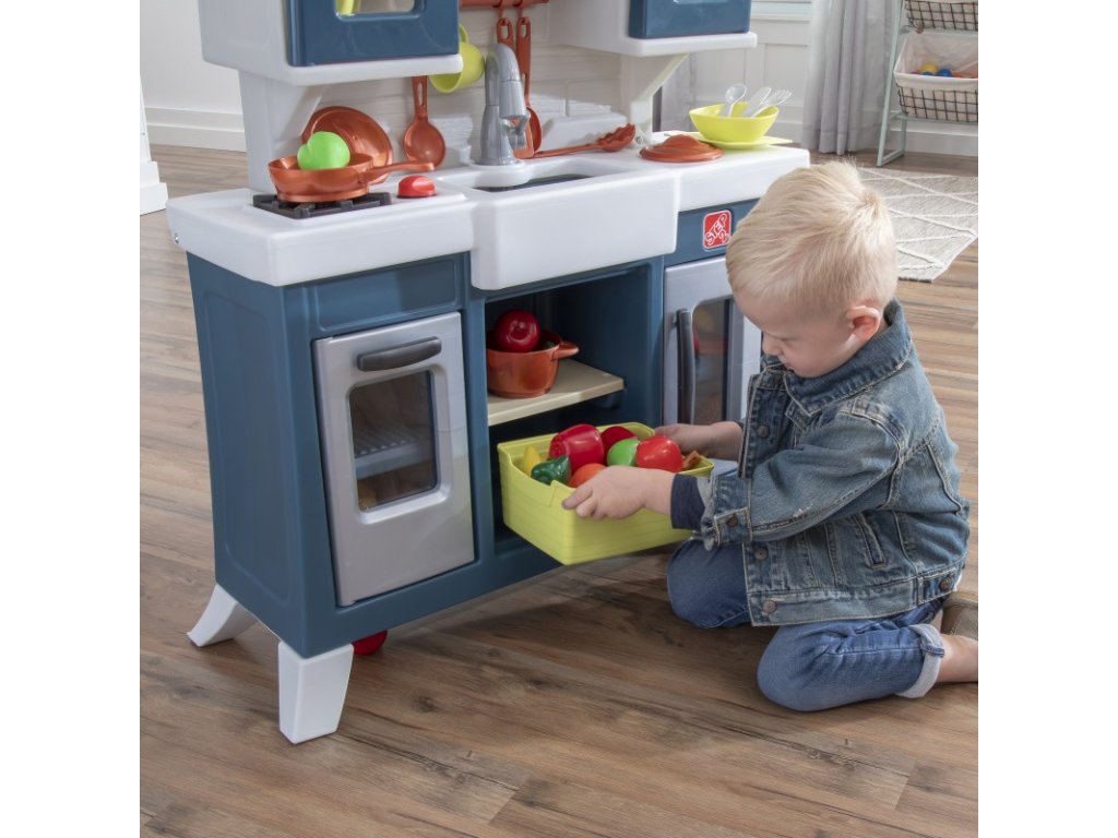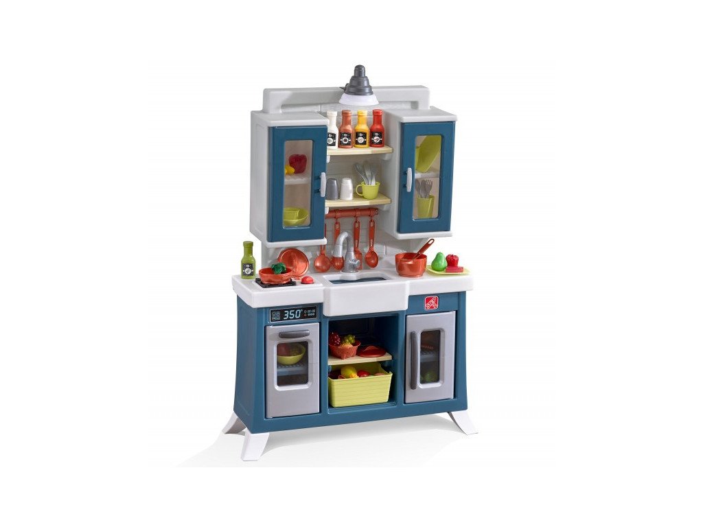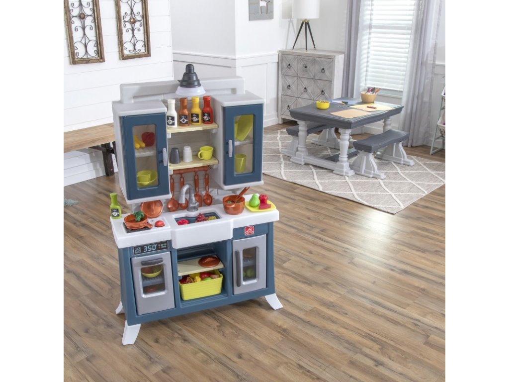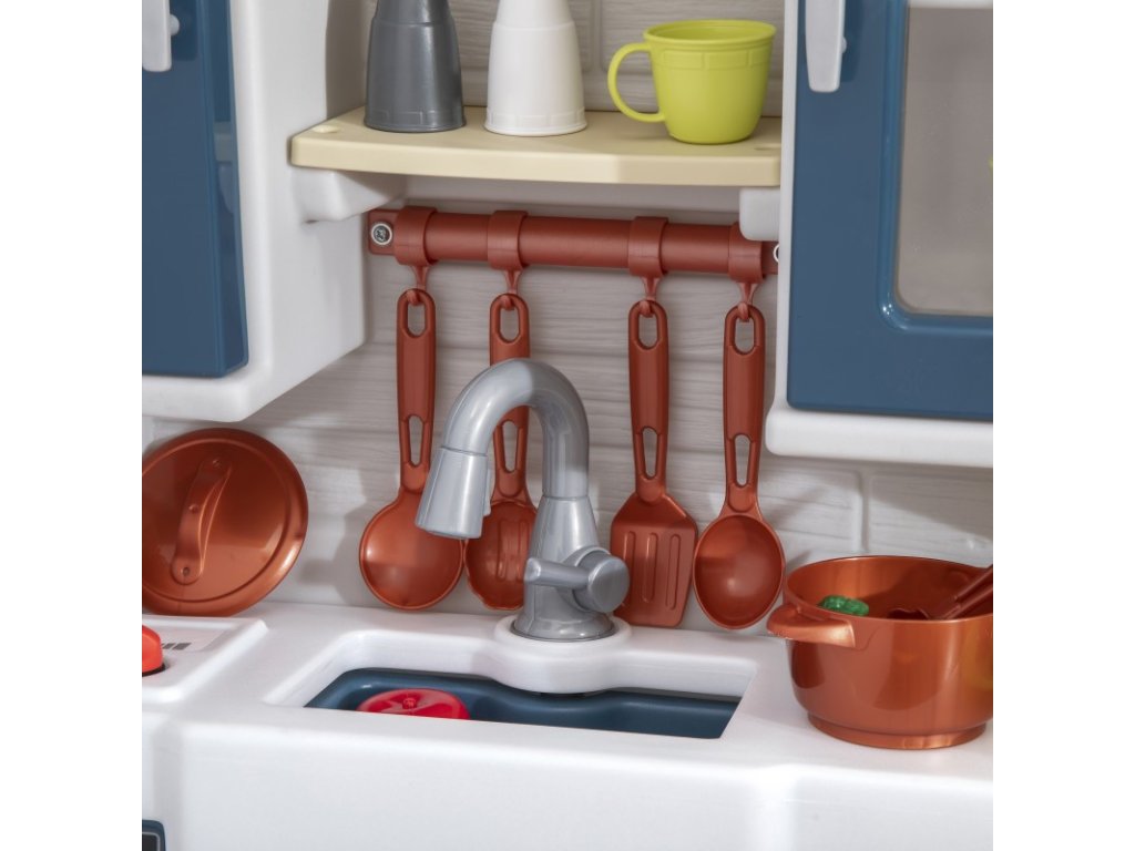 Detská kuchynka na hranie od spoločnosti Step2 sa vyznačuje tým, žerealistická estetika vidiecky šik s modernou funkčnosťou a množstvom úložného priestoru! Pripravujte si jedlá na veľkejpracovná doska z umelej žuly. Na prestretie stola siahnite do horných skriniek s policami určenými na šálky a taniere. Hračka má umývadlo vo vidieckom štýle s batériou, realistickú "medenú" závesnú tyč na uskladnenie. Táto kuchynka je štýlovým doplnkom každého priestoru na hranie. Elektronický horák má zábavné svetlá a realistické prskavé zvuky a funkčná závesná lampa nad drezom robí hru na kuchyňu skutočnosťou Výrobok vyžaduje 2 batérie typu "AA" a 2 batérie typu "AAA" (nie sú súčasťou balenia)