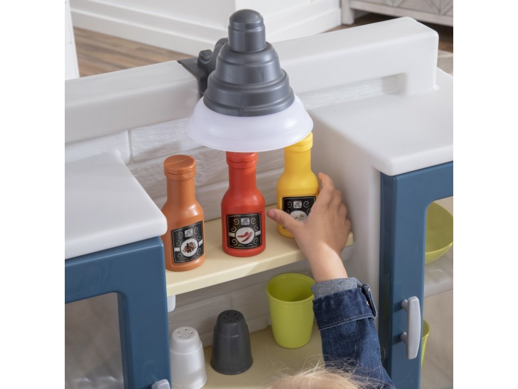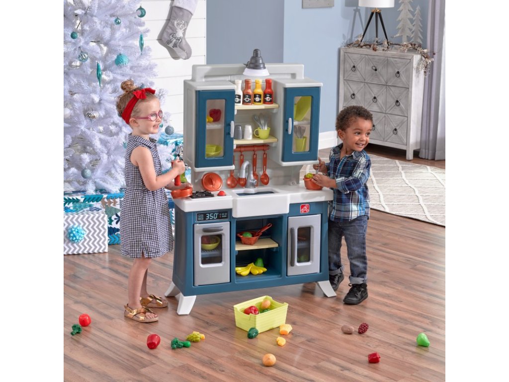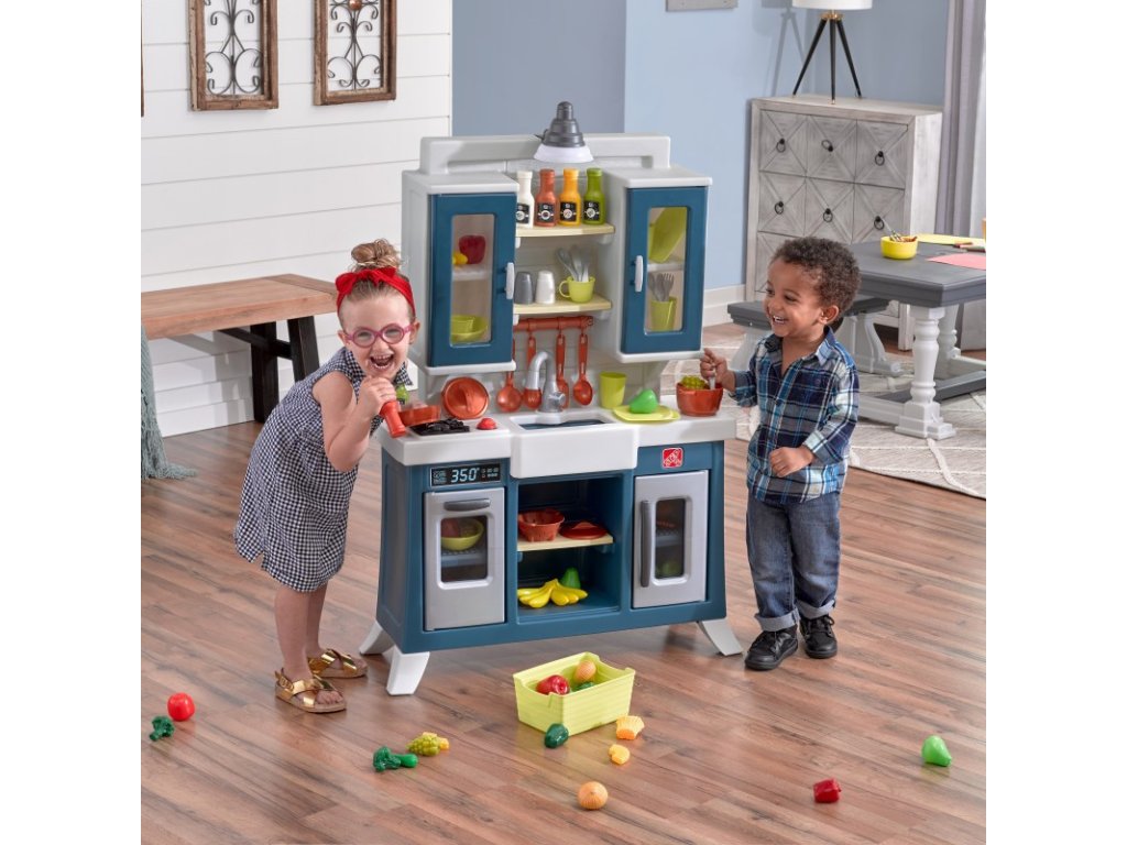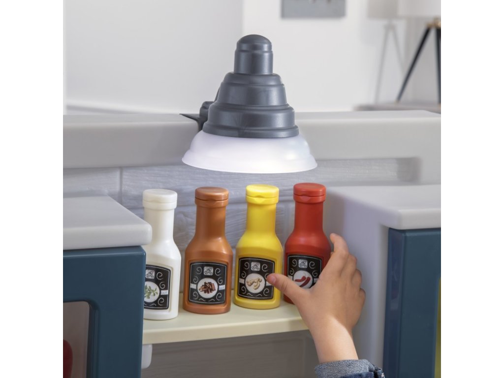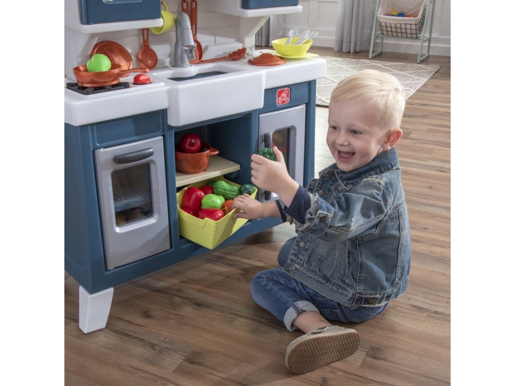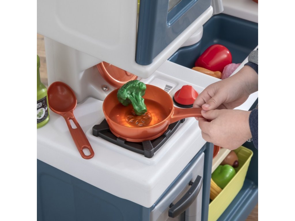 Detská kuchynka na hranie od spoločnosti Step2 sa vyznačuje tým, žerealistická estetika vidiecky šik s modernou funkčnosťou a množstvom úložného priestoru! Pripravujte si jedlá na veľkejpracovná doska z umelej žuly. Na prestretie stola siahnite do horných skriniek s policami určenými na šálky a taniere. Hračka má umývadlo vo vidieckom štýle s batériou, realistickú "medenú" závesnú tyč na uskladnenie. Táto kuchynka je štýlovým doplnkom každého priestoru na hranie. Elektronický horák má zábavné svetlá a realistické prskavé zvuky a funkčná závesná lampa nad drezom robí hru na kuchyňu skutočnosťou Výrobok vyžaduje 2 batérie typu "AA" a 2 batérie typu "AAA" (nie sú súčasťou balenia)
