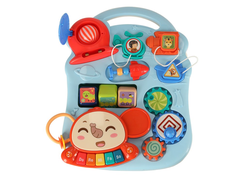 Odnímateľný panel, ktorý je manipulačnou doskou, má množstvo interaktívnych prvkov - klavír, plastové kolieska, kocky, ako aj košík a loptičky.