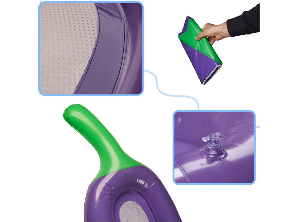 Nafukovací matrac v tvare baklažánu poskytne oveľa vzrušujúcejší zážitok ako konzumácia nejedného grilovaného baklažánu. Táto nezvyčajná verzia ovocia pozostáva z nafukovacieho obrysu fialového baklažánu so zeleným chvostom.