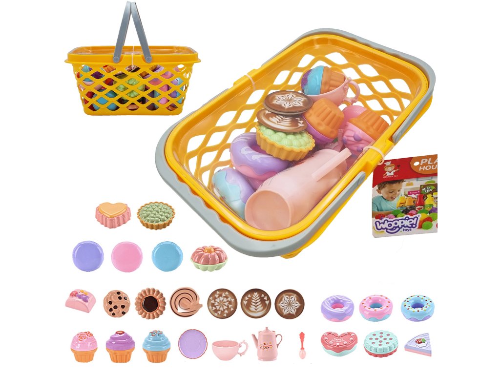Veľký nákupný košík od značkyWOOPIE je ideálnym doplnkom supermarketov. Dieťa môžestelesňujú ja v rodičia nakupujú a idú na čaj alebo kávu s priateľmi. Košík mápohodlné rukoväť a je naplnenýveľa sladkostí. Okrem súpravy obsahuje/čajový serviskáva a sladkosti, ako sú koláče, zákusky, šišky, makrónky a cupcakes. Celkovo sa na trhu nachádza až26 prvkov! Hry vhranie rolí pozitívne rozvíjať dieťa - rozvíjaťpredstavivosť ikreativita ainformovanosť každodenný život.