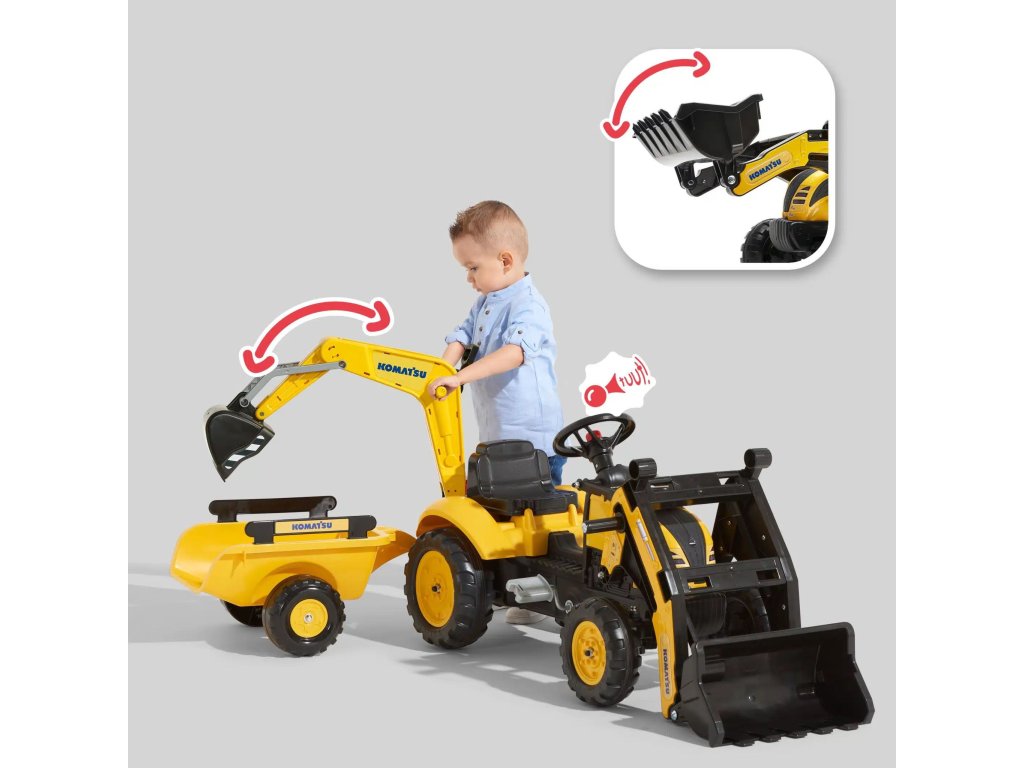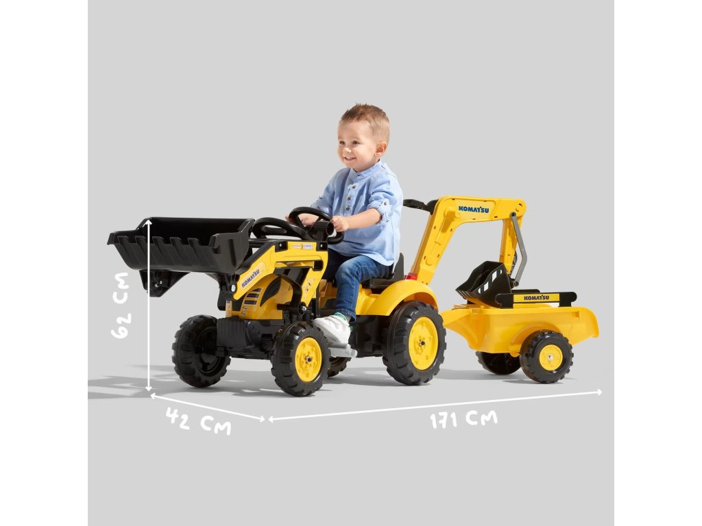 Oficiálne licencovanéšliapací traktor Komatsu od značkyFALK je splneným snom každého malého staviteľa. Toto pôsobivé vozidlo, ktoré je navrhnuté ako autentická zmenšenina skutočného stavebného stroja, bolo špeciálne vytvorené pre deti vo veku od2 až 5 rokov. Vyrába sa 100 % vo Francúzsku a spája v sebe odolnosť, funkčnosť a starostlivosť o životné prostredie, pretože sa skladá z30 % recyklovaného plastu. Súprava je vybavená plne funkčnýmpredné vedro, zadná časťrýpadlo a odnímateľnéprívesto zaručuje neobmedzené možnosti hry v záhrade, na pieskovisku alebo na dvore. Vďaka pedálovému pohonu si dieťa rozvíja fyzickú zručnosť a manipulácia s pohyblivými časťami bagra a nakladača podporuje motorickú koordináciu. Volant je vybavenýrohčo dodáva každému stavebnému dobrodružstvu realistickosť. Ide o robustný stroj pripravený na najťažšie výzvy malého operátora.