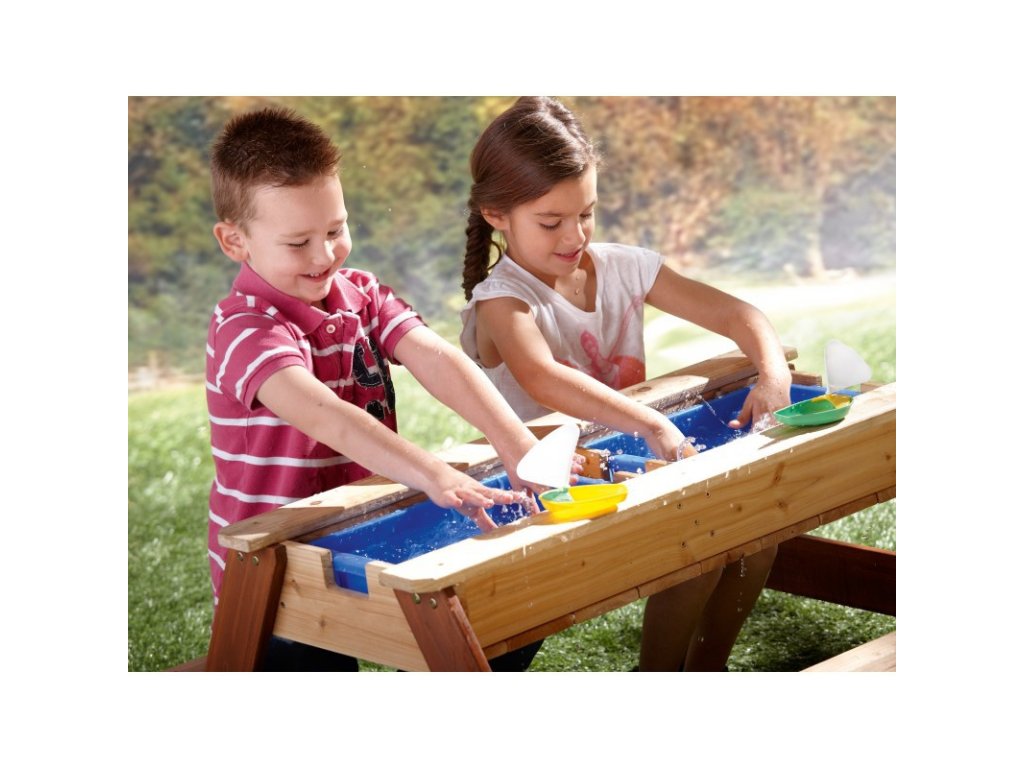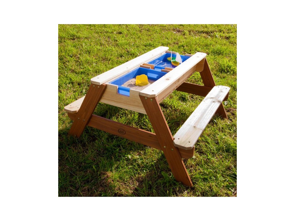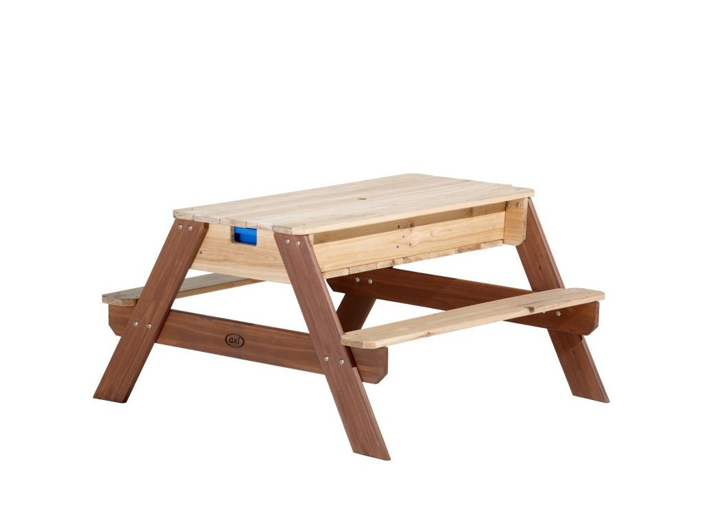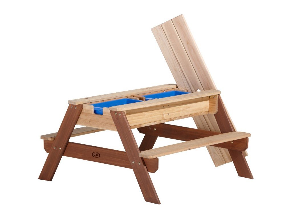 Piknikový stôl Nick od renomovanej značky AXI je multifunkčný stôl, ktorý má pod odnímateľnou vrchnou doskou tajný priestor s dvoma modrými nádobami. Tieto modré nádoby sa dajú naplniť pieskom a/alebo vodou, ale samozrejme sa do nich dajú uložiť aj hračky. Okrem toho sú nádoby odnímateľnýtakže sa ľahko čistia. Klasická kombinácia piesku a vody na deti vždy zaberá! Za chvíľu premeníte stôl s pieskom a vodou na piknikový stôl, kde môžu deti tvoriť, kresliť alebo si pochutnávať na dobrotách.