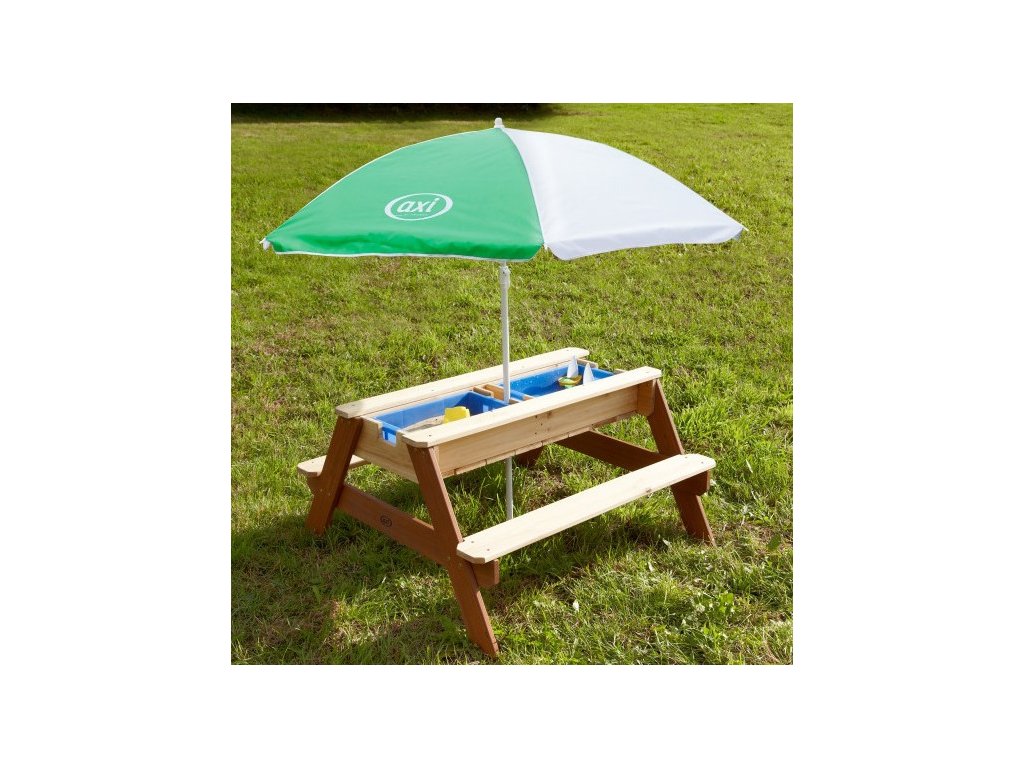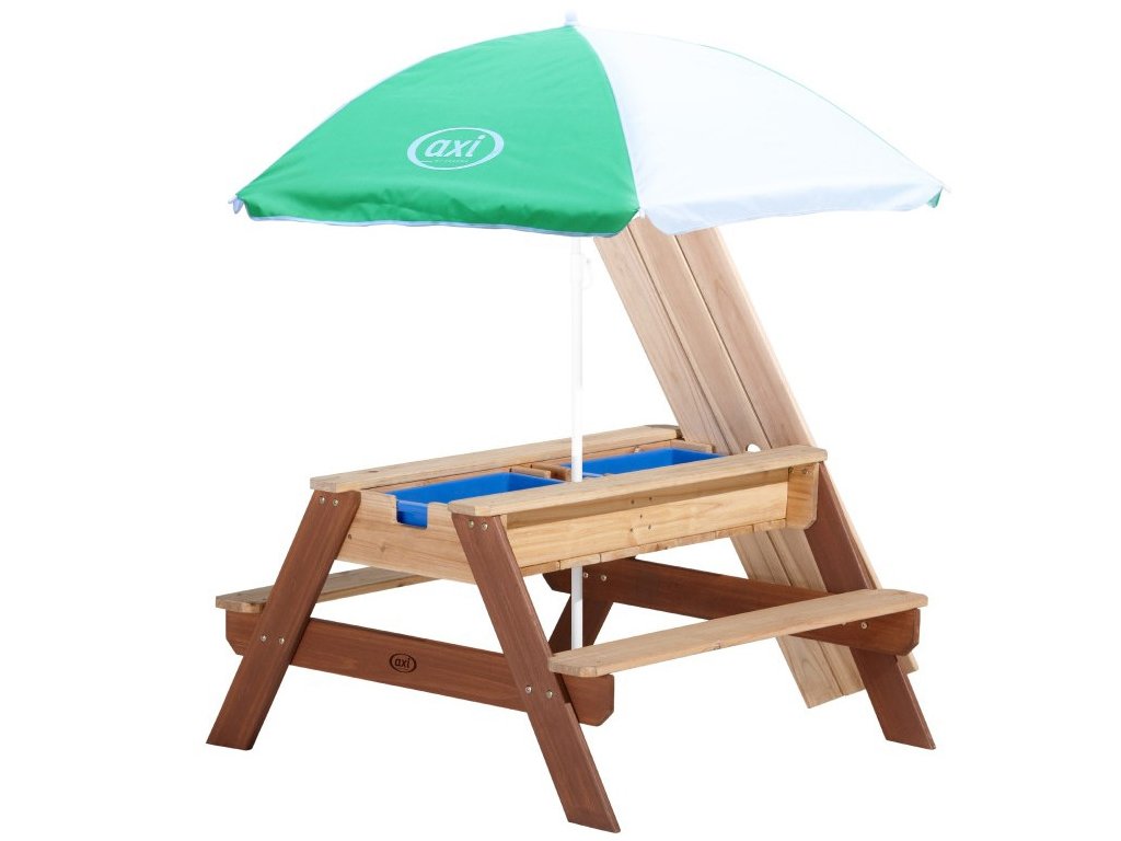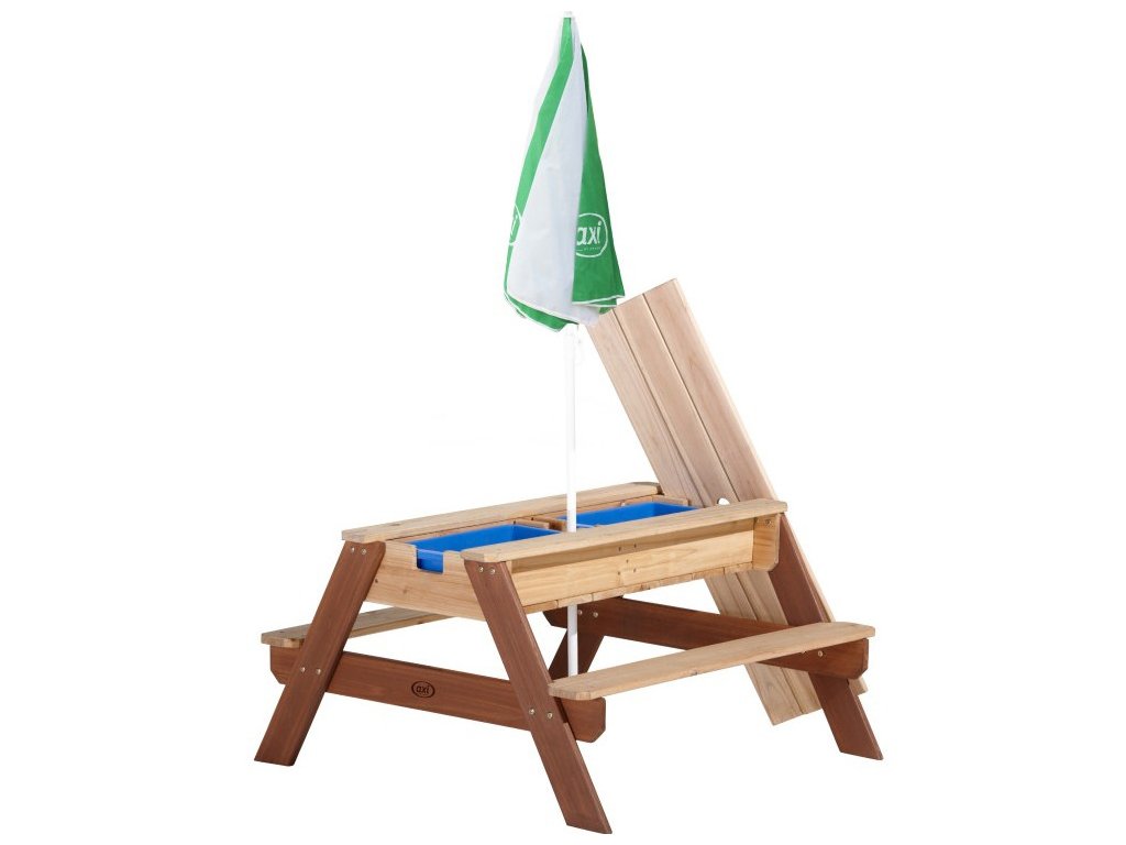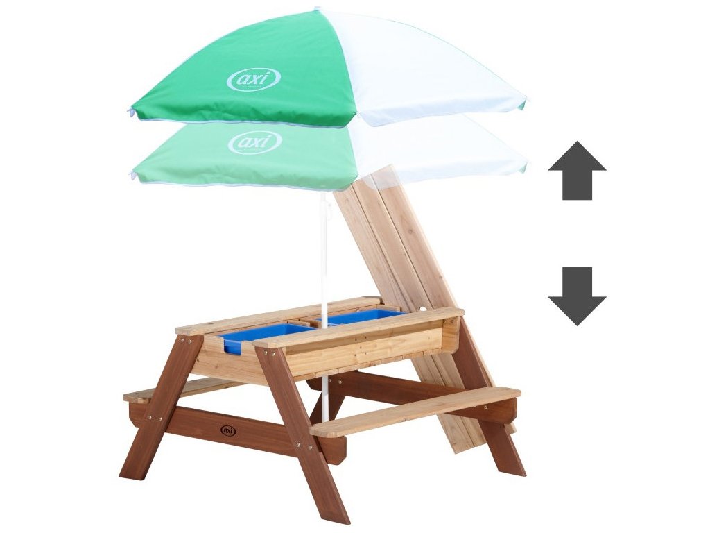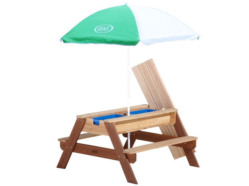 Piknikový stôl AXI Nick s lavičkou a slnečníkom a nádobami na vodu/piesk