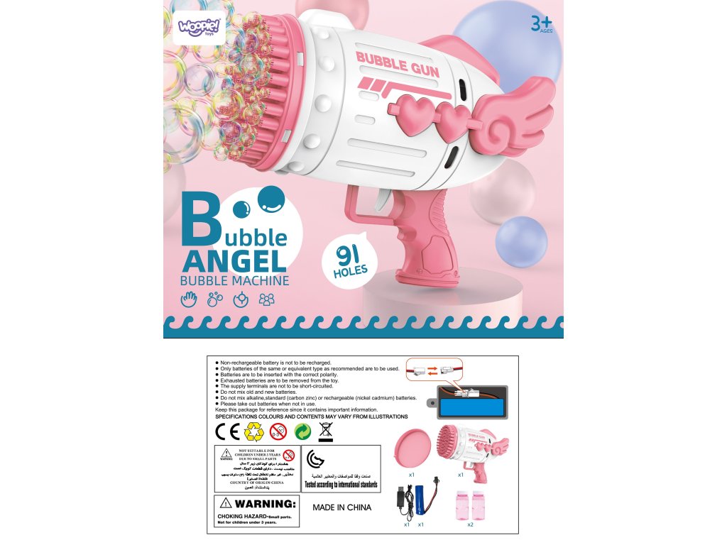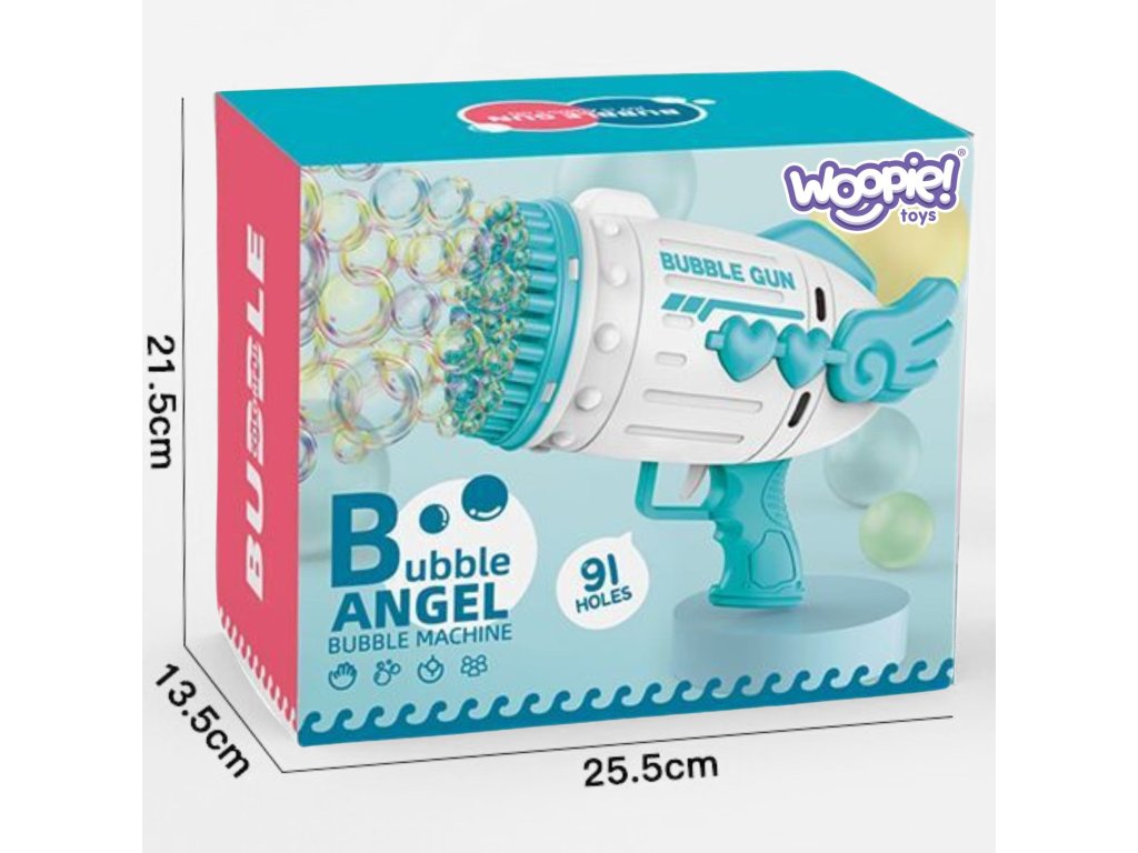 Bublinkový stroj značka v tvare pištoleWOOPIE je skvelá hračka pre deti. Uvoľnené bubliny sú vypálené s vysokou frekvenciou vďaka91 otvorov. Mydlové bubliny sú obľúbená hra malé a veľké deti. Pištoľ na mydlové bubliny je dokonalý darček pretože je jednoduché použitie a veľa zábavy- jediným stlačením spúšte zbraň vystrelí veľa bubliniek. Okrem toho súprava obsahuje 2nádoby s bublinkovou tekutinou. Hračka je ideálna na hranie nasúd a vdomov. Ak chcete uvoľniť mydlové bubliny, stačí po inštalácii batérie namočiť pištoľ do kvapaliny na stojane, stlačiť spúšť pištole a je to! V okamihu máte krásny rozprávkový svetktorédeti aj dospelí budú nadšení.
