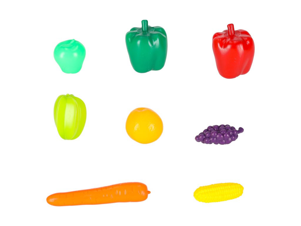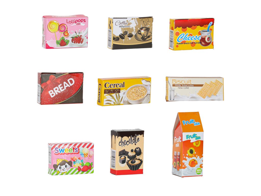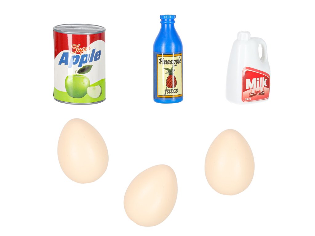 Medzi mnohými prvkami nájdete plastové ovocie, zeleninu, vajcia a kartónové škatule imitujúce obaly na sušienky, džúsy a cukríky.