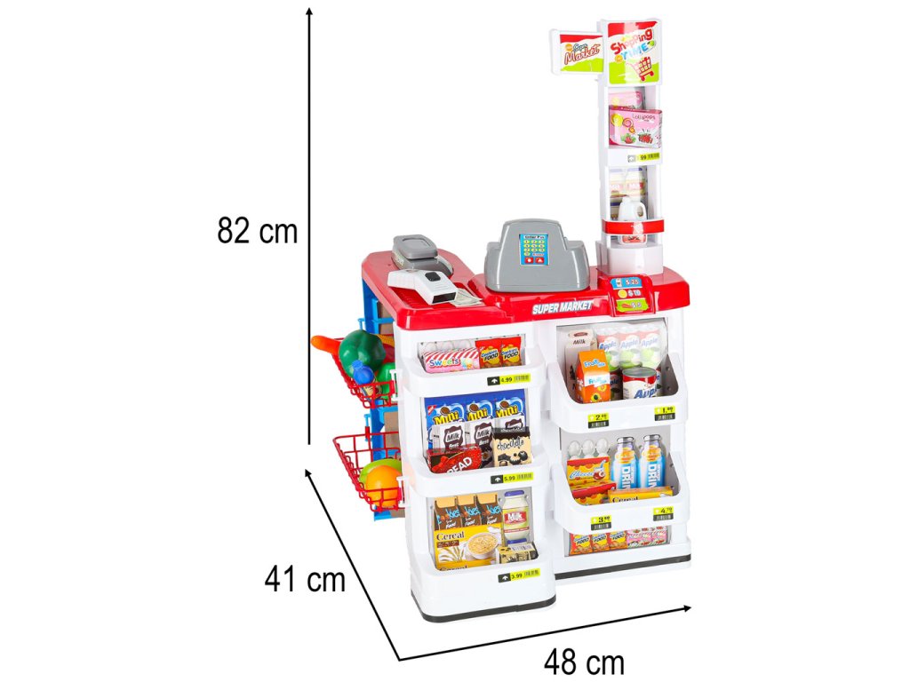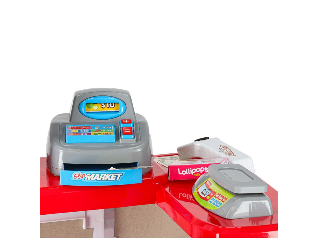Rovnako ako v profesionálnom obchode je hračka vybavená pokladňou s otváracou zásuvkou, čítačkou čiarových kódov a váhou.