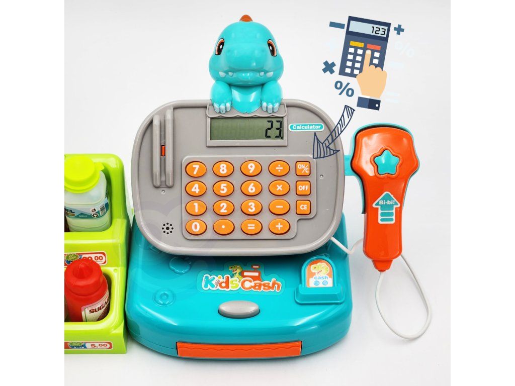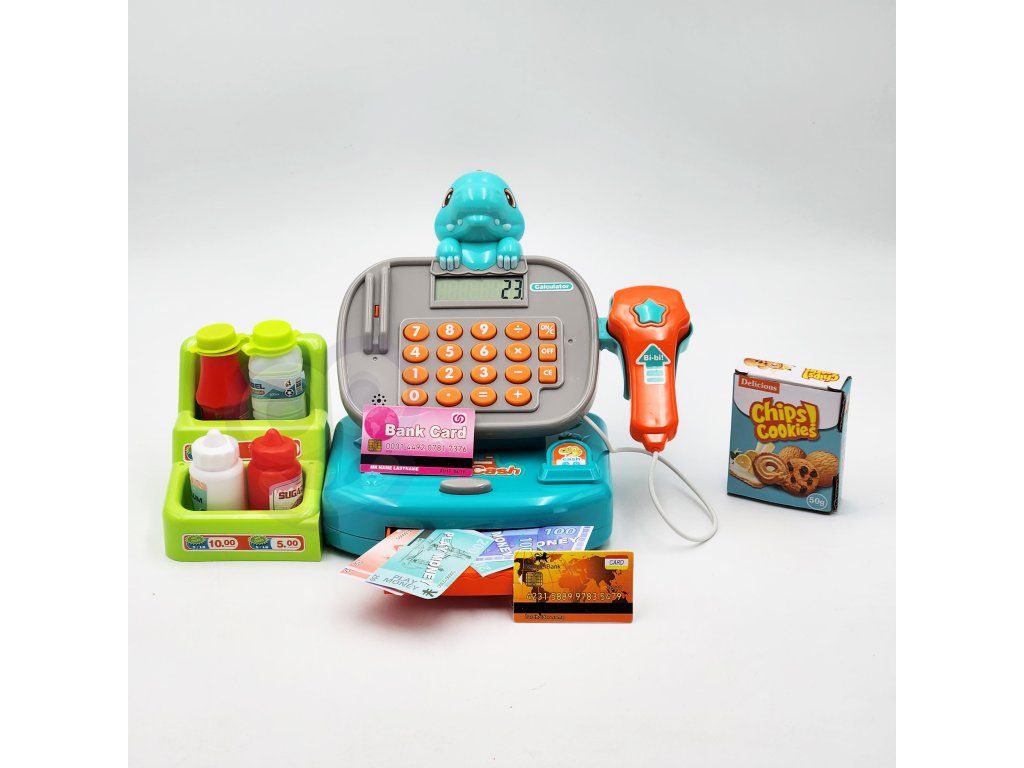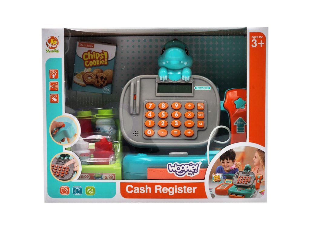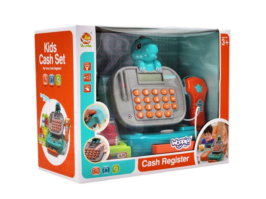 Pokladňa Dino s regálom od značkyWOOPIE je ideálnou možnosťou hry. Deti si môžu vybrať výrobky, ktoré chcú kúpiť, a potom ich nabrať do pokladnice. Pomocou čítačky naskenujú sušienky a ďalšie výrobky. Nakupujúci potom môže zaplatiť peniazmi alebo platobnou kartou.