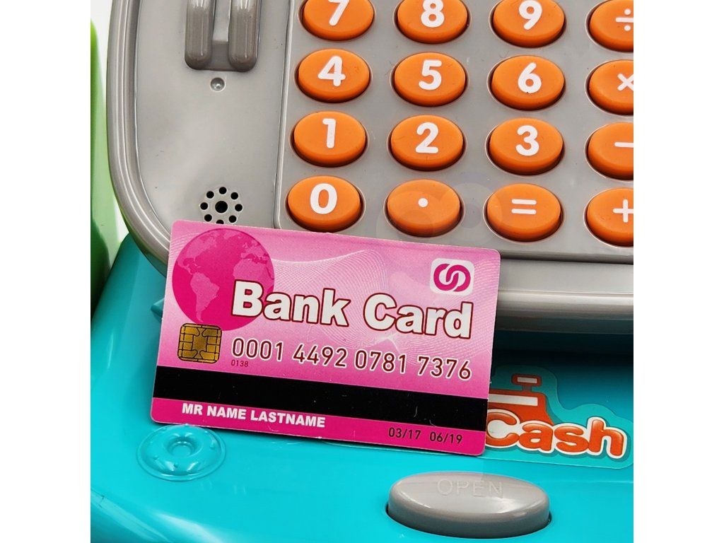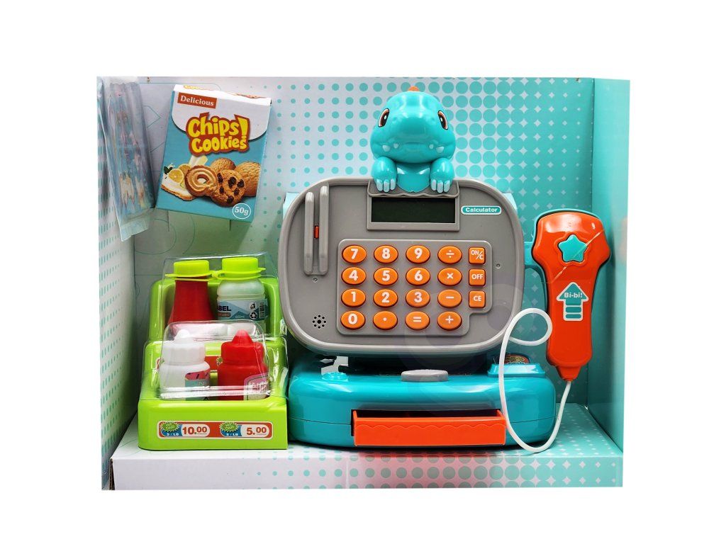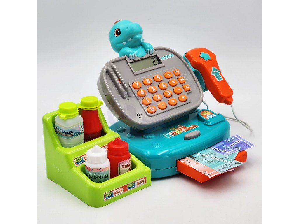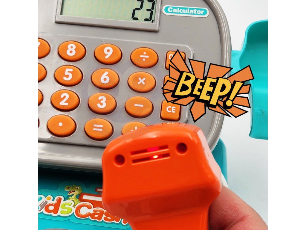 Pokladňa Dino s regálom od značkyWOOPIE je ideálnou možnosťou hry. Deti si môžu vybrať výrobky, ktoré chcú kúpiť, a potom ich nabrať do pokladnice. Pomocou čítačky naskenujú sušienky a ďalšie výrobky. Nakupujúci potom môže zaplatiť peniazmi alebo platobnou kartou.