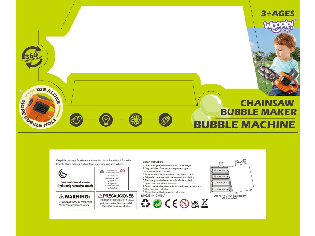 Výroba zbrane Mydlové bubliny - Reťazová píla od značkyWOOPIE je výnimočná pomôcka, ktorá posunie zábavu na úplne novú úroveň. Nie je to len hračka, ale skutočná atrakcia, ktorá sa uplatní na každej párty, v záhrade alebo počas obyčajného popoludnia stráveného vonku. Vďaka svojmu inovatívnemu dizajnu avýnimočné vizuálne efekty, sa určite stane obľúbenou pomôckou pre deti aj dospelých a poskytne im veľa zábavy a nezabudnuteľných chvíľ. Čepeľový nástavec píly je odnímateľný, čo znamená, že v okamihu môžetepremeniť ju z motorovej píly na štýlový stroj do bublín. Skutočné kúzlo sa začne, keď sa pištoľ zapne. Otvor, z ktorého vyletia bubliny, nielenžesvietiale ajotáča sa o 360 stupňov. Tento pohyb vytvára úžasný efekt, ktorý umocňuje vizuálny zážitok a spôsobuje, že bubliny sa vznášajú vo vzduchu tými najneočakávanejšími smermi.