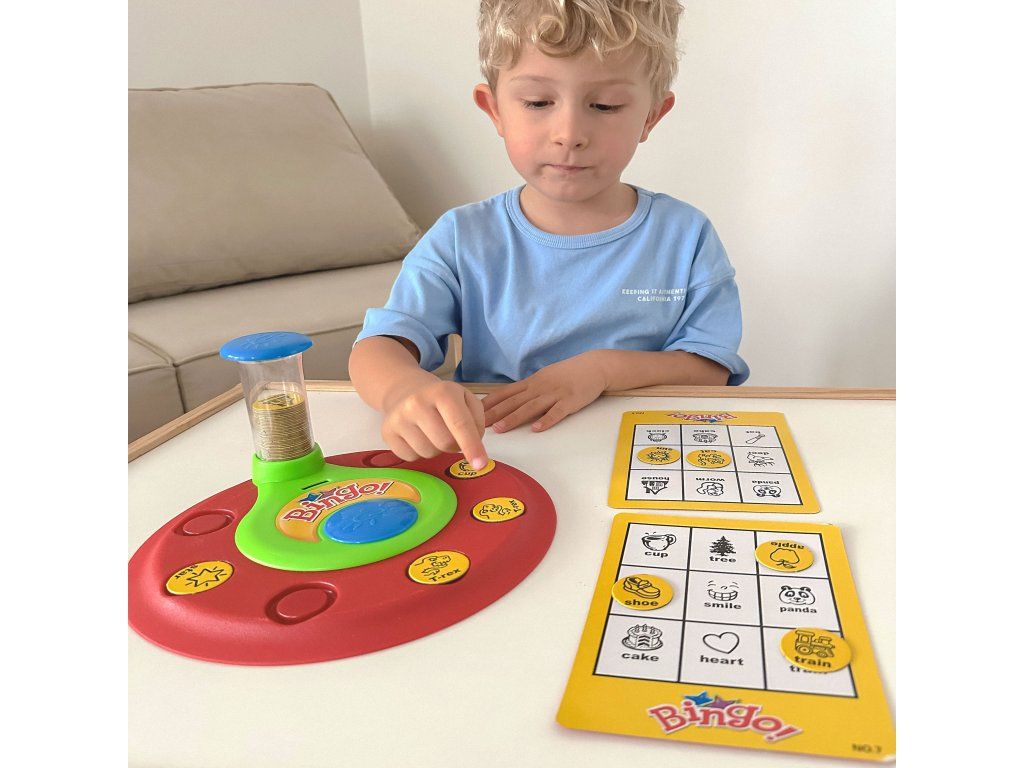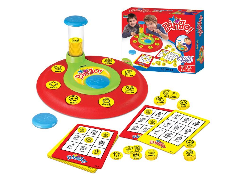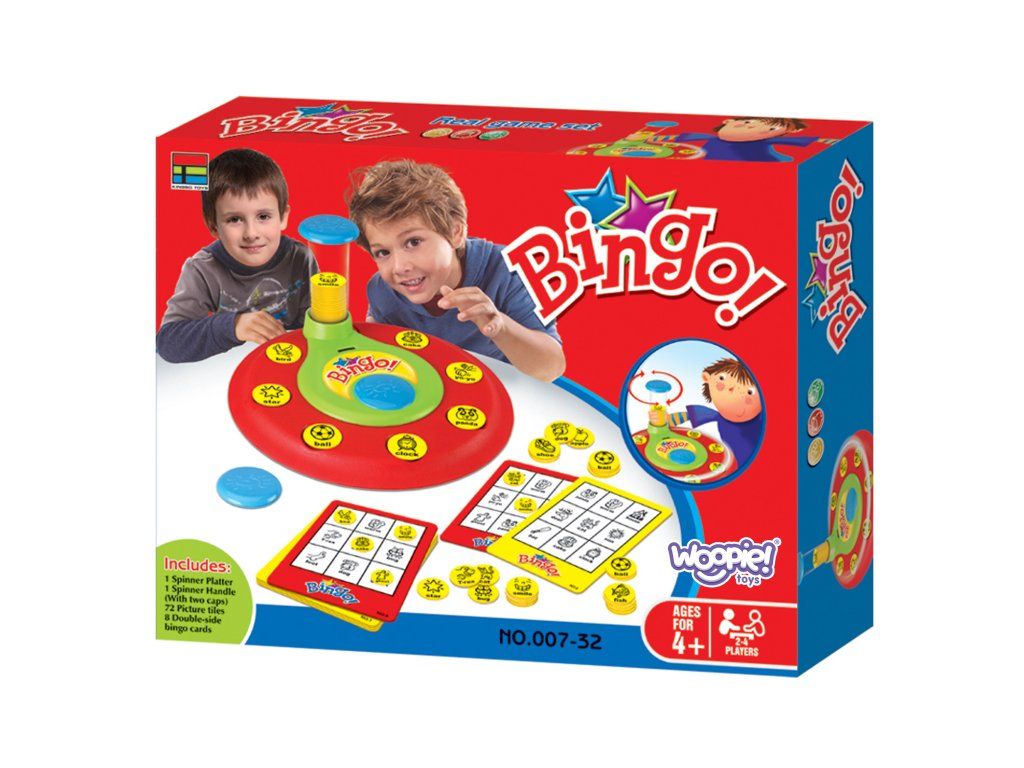 HraBINGO od značkyWoopie je ideálna pre predškolákov a školákov, pretože používa obrázky aj slová. Hra spočíva v pohybe kolesa Bingo, ktoré počas jedného otočenia kolesa uvoľní sedem žetónov. Keď hráči zbadajú žetón, ktorý sa zhoduje s obrázkom na ich karte, slovne uvedú názov predmetu na obrázku, chytia príslušný žetón a umiestnia ho na kartu vedľa príslušného obrázka. Hráč, ktorý ako prvý pokryje všetky obrázky na svojej karte zhodnými žetónmi, zakričí BINGO a vyhráva hru.