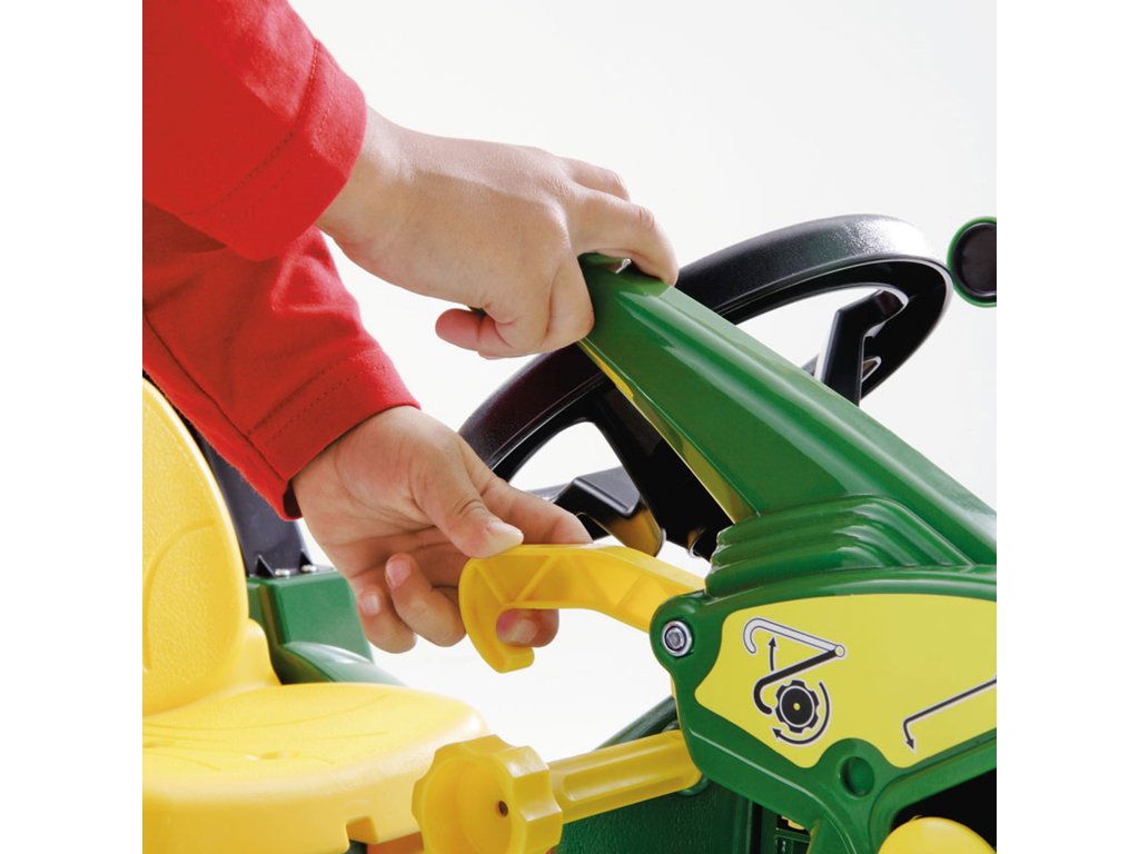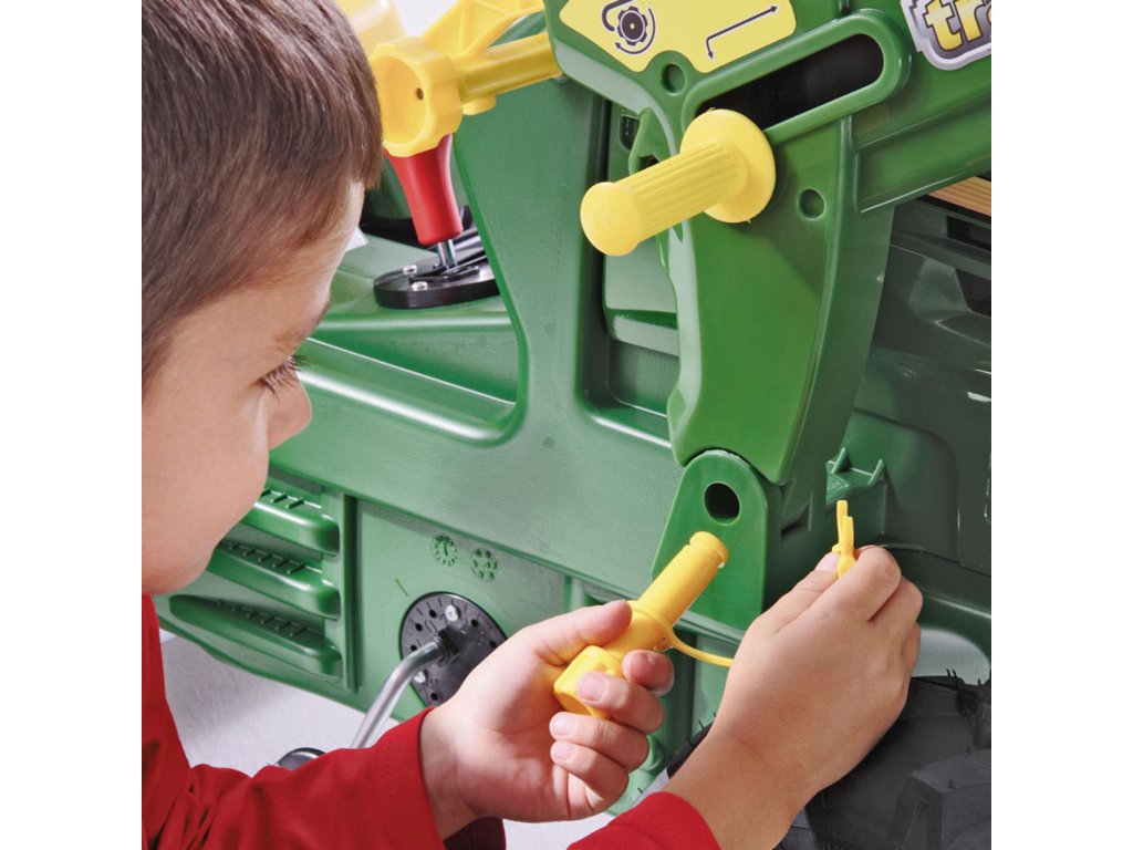 Pedálový traktor rollyFarmtrac John Deere 7930od značky Rolly Toys je nielen odolný, ale aj ľahko sa čistí, čo z neho robí dokonalého kamaráta na hranievonku a vo vnútri. Traktor je vybavený aj ručnou brzdou, vďaka ktorej sa deti môžu cítiť ako skutoční vodiči. Možnosť samostatného brzdenia dodáva hre realistickosť a vzrušenie a zároveň učí batoľatá základným pravidlám bezpečnosti na cestách. Traktor možno navyše vybaviťodnímateľný prívesčo poskytuje ešte viac príležitostí na kreatívne hranie. Deti môžu prepravovať svoje obľúbené hračky a tiež pomáhať pri prácach na záhrade, čo rozvíja ichpredstavivosť izručnosti motorické zručnosti. Nesmieme zabudnúť na pohyblivú, odnímateľnú lyžicu rýpadla, ktorá je ďalším prvkom zvyšujúcim funkčnosť a atraktívnosť traktora. Vďaka nej sa deti môžu hrať na malých stavbárov, premiestňovať piesok, zeminu alebo iné materiály, čo poskytuje nekonečné možnosti hry. Hlavným lákadlom tohto traktora je jehoprevodovkaktorý funguje na princípe bicyklovej prehadzovačky a ponúka dva prevody a funkciu voľnobehu. Vďaka tomu je jazda traktora plynulá a vhodná pre zručnosti mladých vodičov a mechanizmus reťazového prevodu umožňuje bezpečné a jednoduché ovládanie aj pre tých najmenších. Celý mechanický systém je starostlivo zakrytý, čím sa zabezpečuje, že dieťa k nemu nemá prístup, a poskytujeúplná bezpečnosť počas hry.