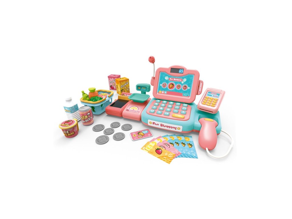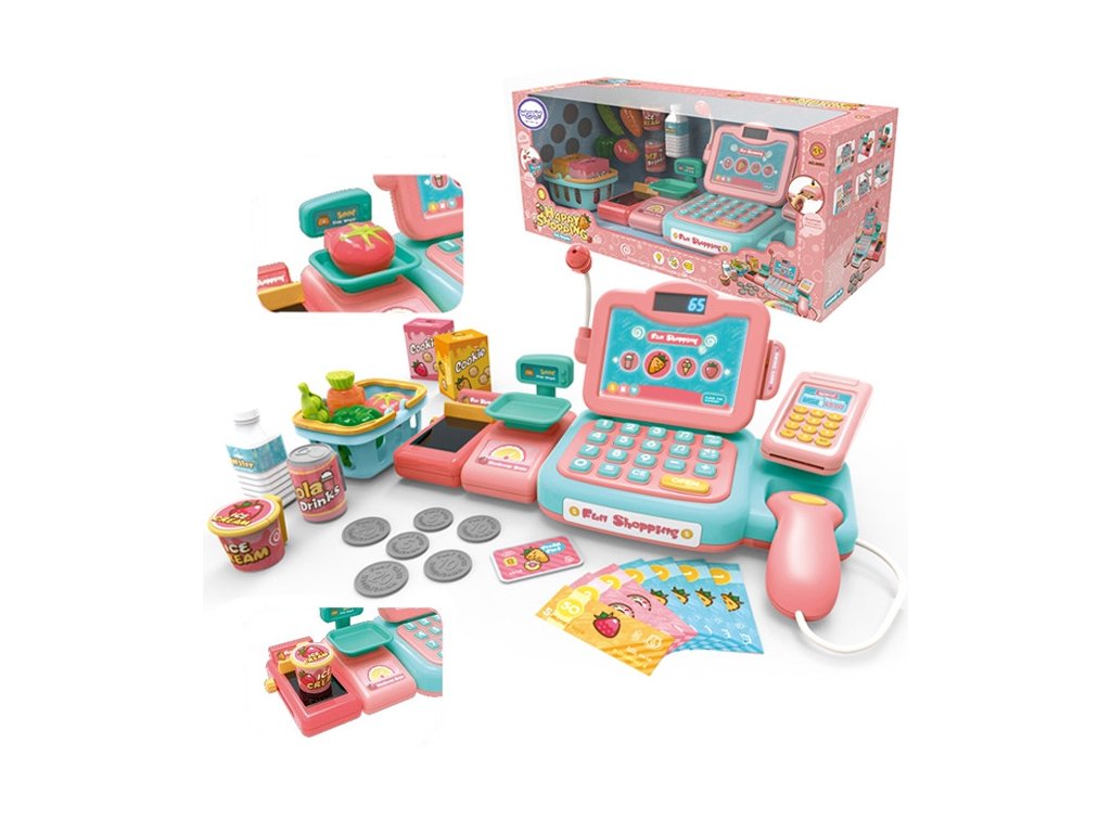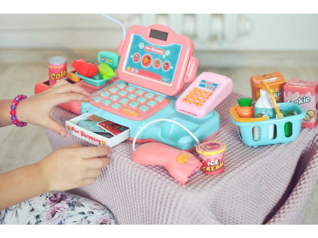 - - Súprava obsahuje:nákupný košík,zeleninu, ovocie, balíček sušienok, platobnú kartu, falošné bankovky a mince, telefón, fľašu vody, kolu a zmrzlinu,